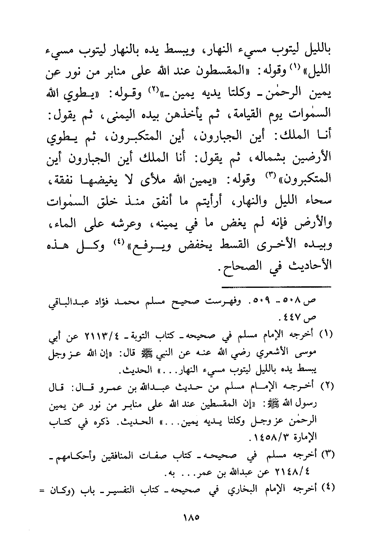 بالليل ليتوب مسيء النهار، ويبسط يده بالنهار ليتوب مسيء الليل" 1، وقوله: "المقسطون عند الله على منابر من نور عن يمين الرحمن –وكلتا يديه يمين-" 2 وقوله: " يطوي الله السموات يوم القيامة، ثم يأخذهن بيده اليمنى، ثم يقول: أنا الملك أين الجبارون، أين المتكبرون، ثم يطوي الأرضين بشماله، ثم يقول: أنا الملك أين الجبارون أين المتكبرون" 3 وقوله: "يمين الله ملأى لا يغيضها نفقة، سحاء الليل والنهار، أرأيتم ما أنفق منذ خلق السموات والأرض فإنه لم يغض ما في يمينه، وعرشه على الماء، وبيده الأخرى القسط يخفض ويرفع" 4 وكل هذه الأحاديث في الصحاح.