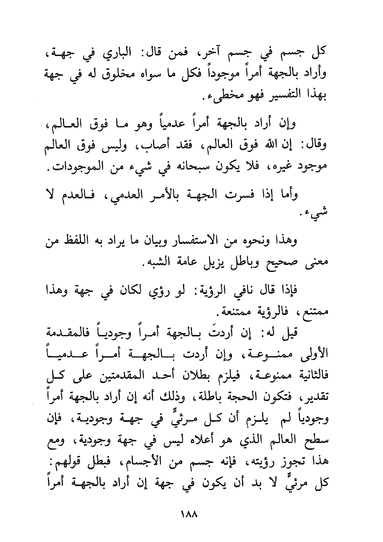 قيل له: إن أردت بالجهة أمراً وجودياً فالمقدمة الأولى ممنوعة، وإن أردت بالجهة أمراً عدمياً، فالثانية ممنوعة، فيلزم بطلان أحد المقدمتين على كل تقدير، فتكون الحجة باطلة، وذلك أنه إن أراد بالجهة أمراً وجودياً لم يلزم أن كل مرئي في جهة وجودية، فإن سطح العالم الذي هو أعلاه ليس في جهة وجودية، ومع هذا تجوز رؤيته، فإنه جسم من الأجسام، فبطل قولهم: كل مرئي لا بد أن يكون في جهة إن أراد بالجهة أمراً
