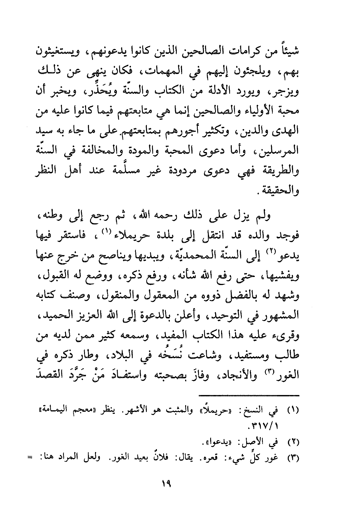 ولم يزل على ذلك رحمه الله، ثم رجع إلى وطنه، فوجد والده قد انتقل إلى بلدة حريملاء1، فاستقر فيها يدعو2 إلى السنة المحمدية، ويبديها ويناصح من خرج عنها ويفشيها، حتى رفع الله شأنه، ورفع ذكره، ووضع له القبول، وشهد له بالفضل ذووه من المعقول والمنقول، وصنف كتابه المشهور في التوحيد، وأعلن بالدعوة إلى الله العزيز الحميد، وقرئ عليه هذا الكتاب المفيد، وسمعه كثير ممن لدية من طالب ومستفيد، وشاعت نسخه في البلاد، وطار ذكره في الغور3 والأنجاد، وفاز بصحبته واستفاد من جرد القصد