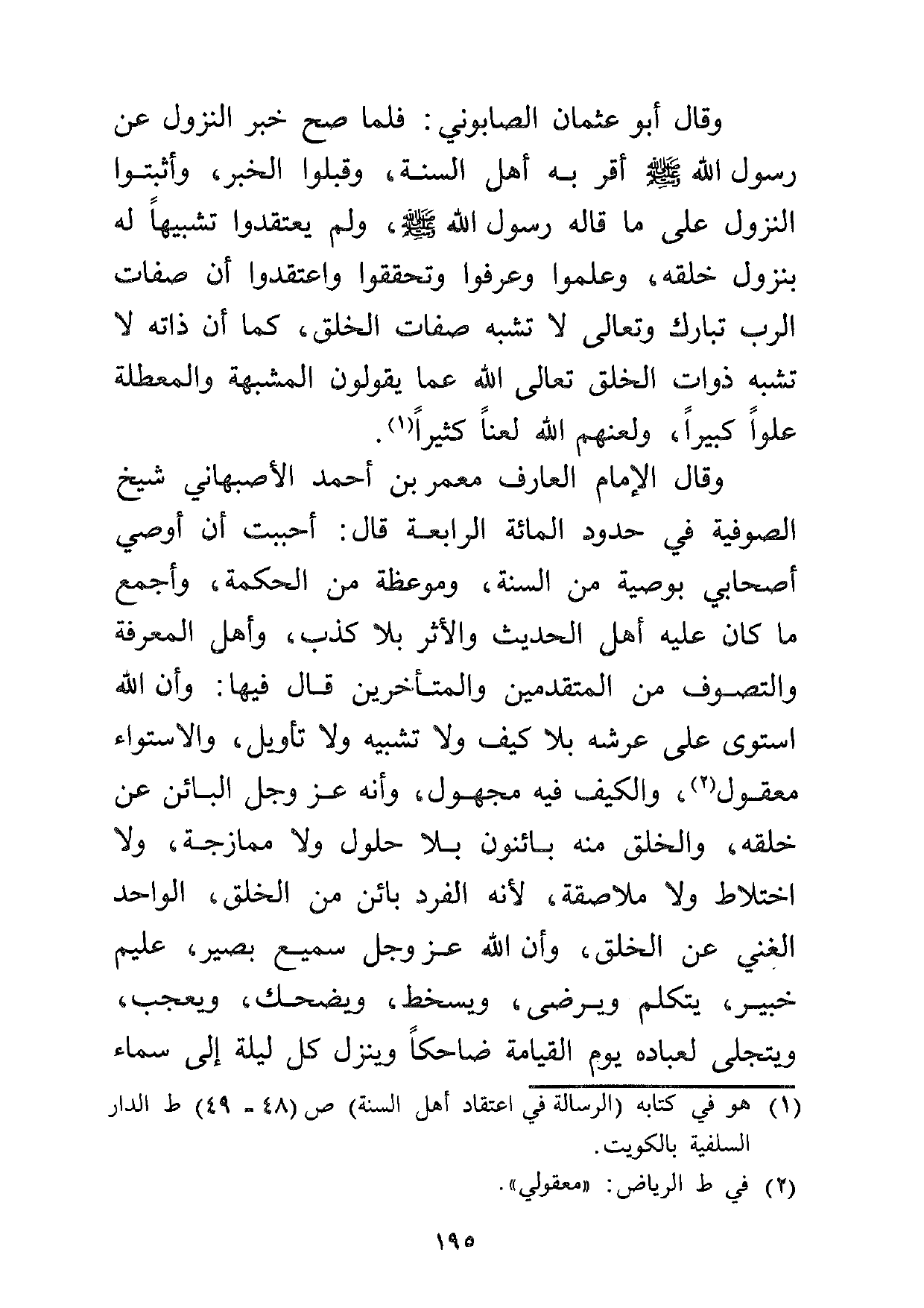 وقال أبو عثمان الصابوني: فلما صح خبر النزول عن رسول الله صلى الله عليه وسلم أقر به أهل السنة، وقبلوا الخبر، وأثبتوا النزول على ما قاله رسول الله صلى الله عليه وسلم، ولم يعتقدوا تشبيهاً له بنزول خلقه، وعلموا وعرفوا وتحققوا واعتقدوا أن صفات الرب تبارك وتعالى لا تشبة صفات الخلق، كما أن ذاته لا تشبه ذوات الخلق تعالى الله عما يقولون المشبهة والمعطلة علوا كبيرا، ولعنهم الله لعنا كثيراً1.