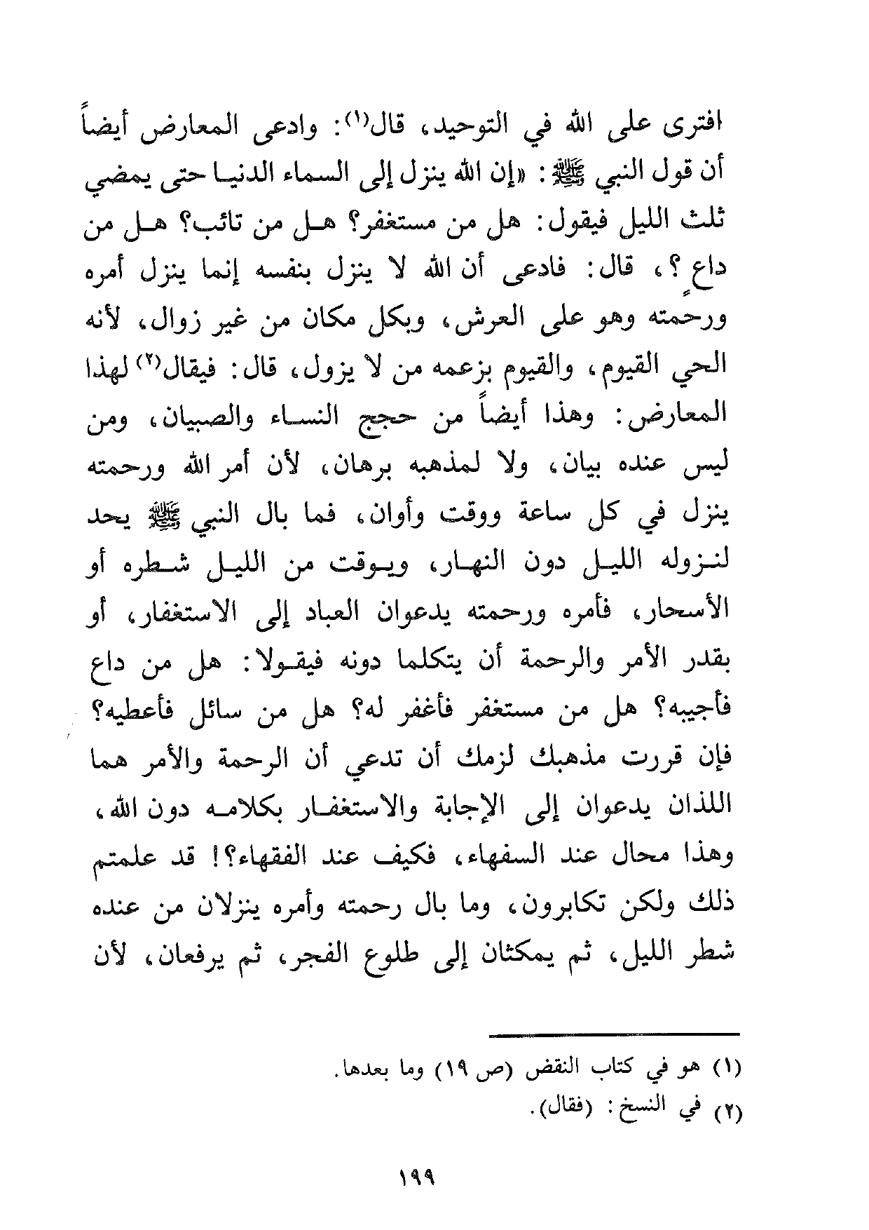 افترى على الله في التوحيد، قال1: وادعى المعارض أيضاً أن قول النبي صلى الله عليه وسلم: " إن الله ينزل إلى السماء الدنيا حتى يمضي ثلث الليل فيقول: هل من مستغفر؟ هل من تائب؟ هل من داع؟ "، قال: فادعى أن الله لا ينزل بنفسه إنما ينزل أمره ورحمته وهو على العرش، وبكل مكان من غير زوال، لأنه الحي القيوم، والقيوم بزعمه من لا يزول، قال: فيقال2 لهذا المعارض: وهذا أيضاً من حجج النساء والصبيان، ومن ليس عنده بيان، ولا لمذهبه برهان، لأن أمر الله ورحمته ينزل في كل ساعة ووقت وأوان، فما بال النبي صلى الله عليه وسلم يحد لنزوله الليل دون النهار، ويوقت الليل شطره أو الأسحار، فأمره ورحمته يدعوان العباد إلى الاستغفار، أو بقدر الأمر والرحمة أن يتكلما دونه فيقولا: هل من داع فأجيبه؟ هل من مستغفر فأغفر له؟ هل من سائل فأعطيه؟ فإن قررت مذهبك لزمك أن تدعي أن الرحمة والأمر هما اللذان يدعوان إلى الإجابة والاستغفار بكلامه دون الله، وهذا محال عند السفهاء، فكيف عند الفقهاء؟! قد علمتم ذلك ولكن تكابرون، وما بال رحمته وأمره ينزلان من عنده شطر الليل ثم يمكثان إلى طلوع الفجر، ثم يرفعان، لأن