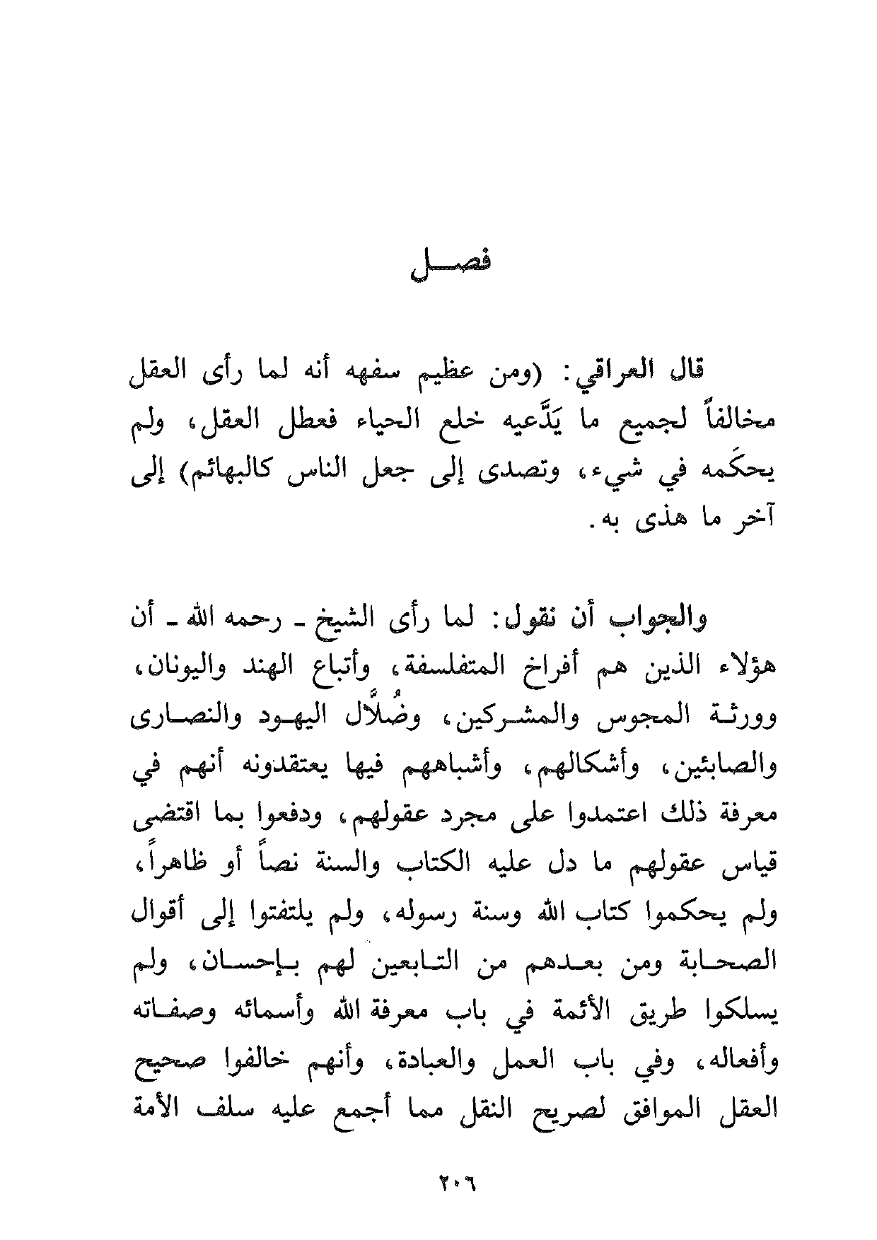والجواب أن نقول: لما رأى الشيخ رحمه الله أن هؤلاء الذين هم أفراخ المتفلسفة، وأتباع الهند واليونان وورثة المجوس والمشركين، وضلال اليهود والنصارى والصابئين، وأشكالهم، وأشباههم فيها يعتقدونه أنهم في معرفة ذلك اعتمدوا على مجرد عقولهم، ودفعوا بما اقتضى قياس عقولهم ما دل على الكتاب والسنة نصاً أو ظاهراً، ولم يحكموا كتاب الله وسنة رسوله، ولم يلتفتوا إلى أقوال الصحابة ومن بعدهم من التابعين لهم بإحسان، ولم يسلكوا طريق الأئمة في باب معرفة الله وأسمائه وصفاته وأفعاله، وفي باب العمل والعبادة، وأنهم خالفوا صحيح العقل الموافق لصريح النقل، مما أجمع عليه سلف الأمة