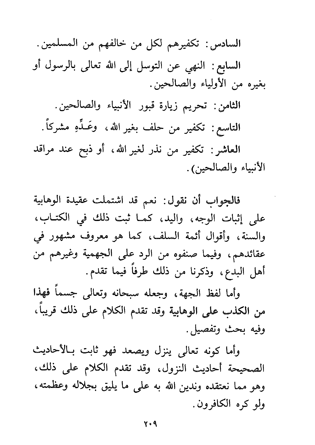 فالجواب أن نقول: نعم قد اشتملت عقيدة الوهابية على إثبات الوجه واليد كما ثبت ذلك في الكتاب والسنة وأقوال أئمة السلف، كما هو معروف مشهور في عقائدهم، وفيما صنفوه من الرد على الجهمية وغيرهم من أهل البدع، وذكرنا من ذلك طرفاً فيما تقدم.