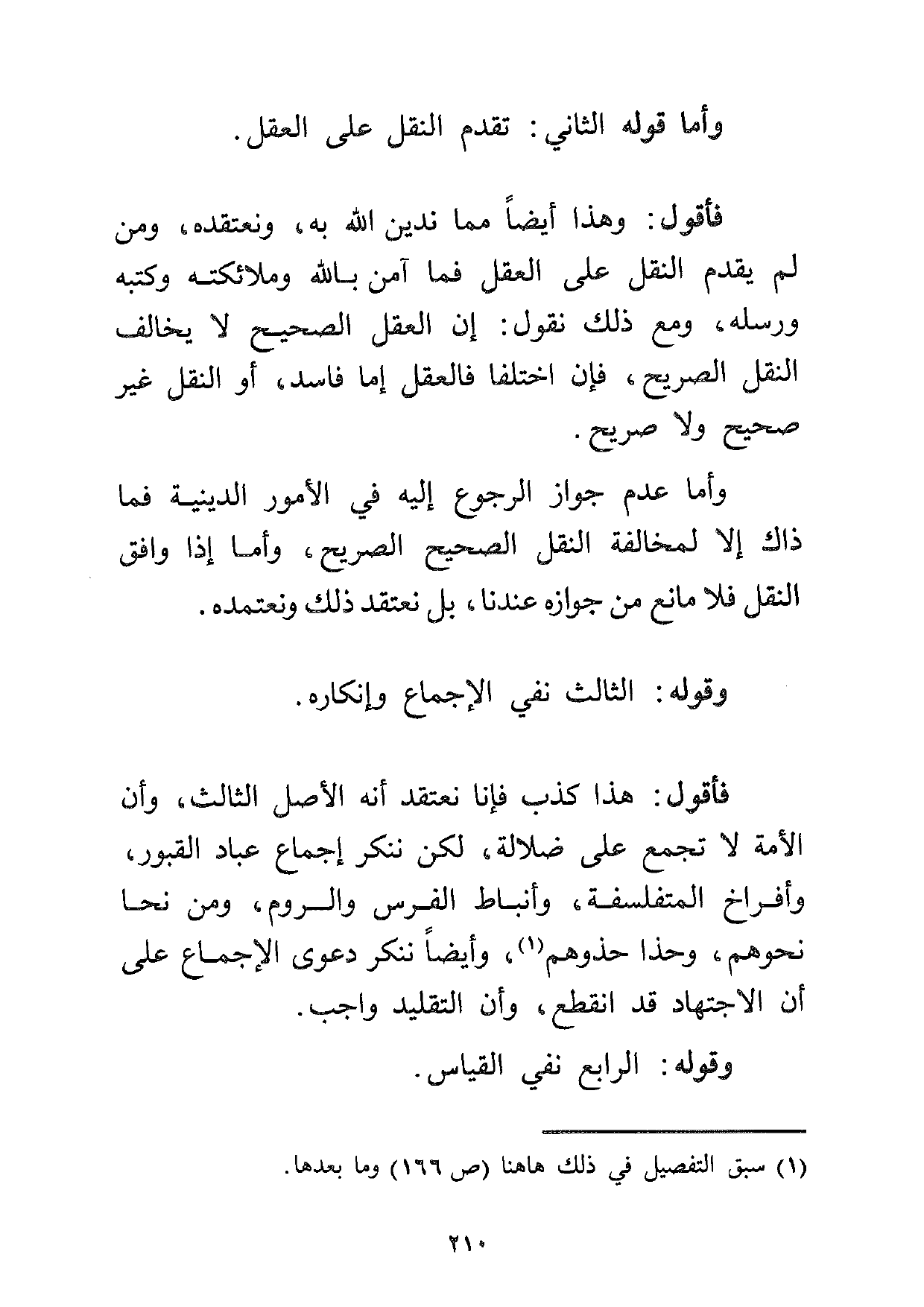 فأقول هذا كذب فإنا نعتقد أنه الأصل الثالث، وأن الأمة لا تجمع على ضلالة، لكن ننكر إجماع عباد القبور، وأفراخ المتفلسفة، وأنباط الفرس والروم، ومن نحا نحوهم، وحذا حذوهم1، وأيضاً ننكر دعوى الإجماع على أن الاجتهاد قد انقطع، وأن التقليد واجب.