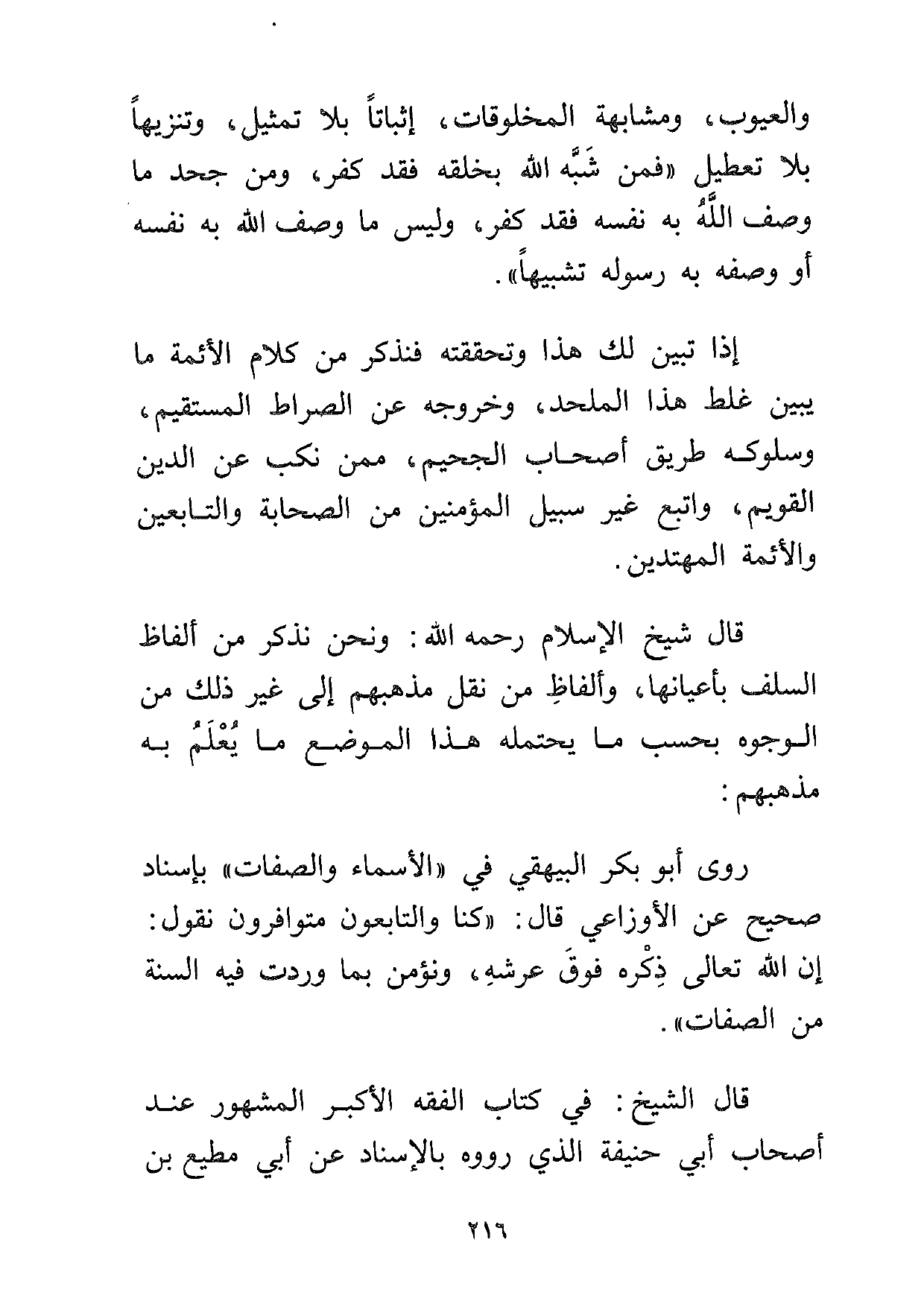 روى أبو بكر البيهقي في "الأسماء والصفات" بإسناد صحيح عن الأوزاعي قال: "كنا والتابعون متوافرون نقول: إن الله تعالى ذكره فوق عرشه، ونؤمن بما وردت فيه السنة من الصفات".