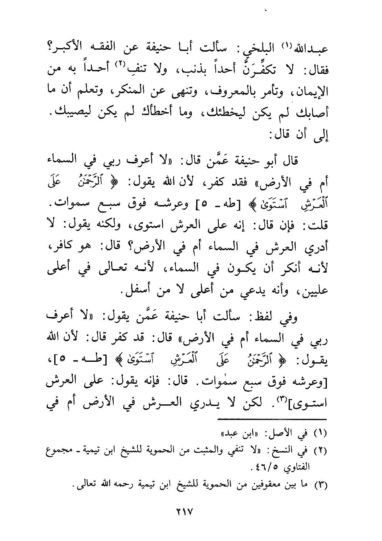 وفي لفظ: سألت أبا حنيفة عمن يقول: "لا أعرف ربي في السماء أم في الأرض" قال: قد كفر قال: لأن الله يقول: {الرَّحْمَنُ عَلَى الْعَرْشِ اسْتَوَى} [طه:5] ، [وعرشه فوق سبع سموات. قال: فإنه يقول على العرش استوى] 3. لكن لا يدري العرش في الأرض أم في
