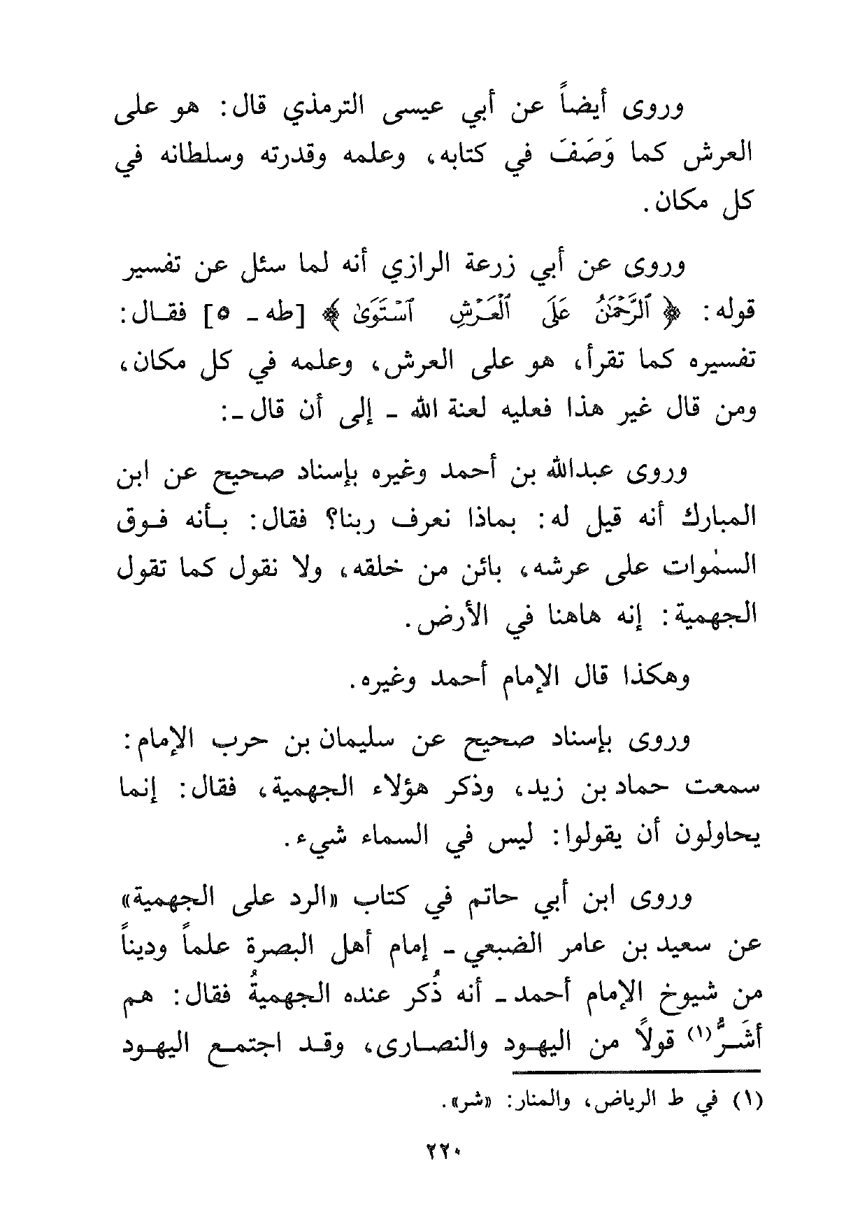 وروى عن أبي زرعة الرازي أنه لما سئل عن تفسير قوله: {الرَّحْمَنُ عَلَى الْعَرْشِ اسْتَوَى} [طه:5] فقال: تفسيره كما تقرأ، هو على العرش، وعلمه في كل مكان، ومن قال غير هذا فعليه لعنة الله –إلى أن قال-: