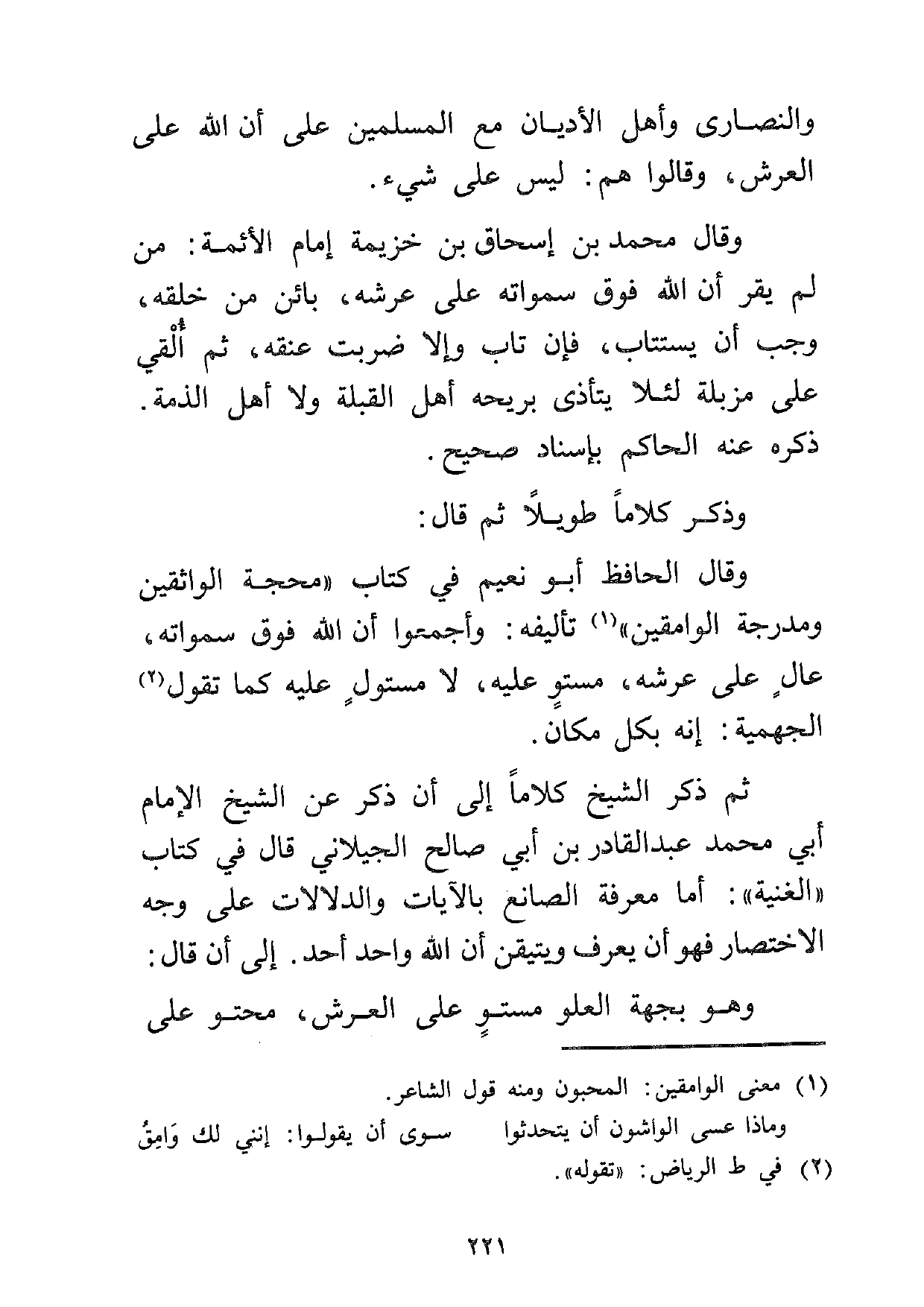 وقال محمد بن إسحاق بن خزيمة إمام الأئمة: من لم يقر أن الله فوق سمواته على عرشه، بائن من خلقه، وجب أن يستتاب، فإن تاب وإلا ضربت عنقه، ثم ألقي على مزبلة لئلا يتأذى بريحه أهل القبلة ولا أهل الذمة. ذكره عنه الحاكم بإسناد صحيح.