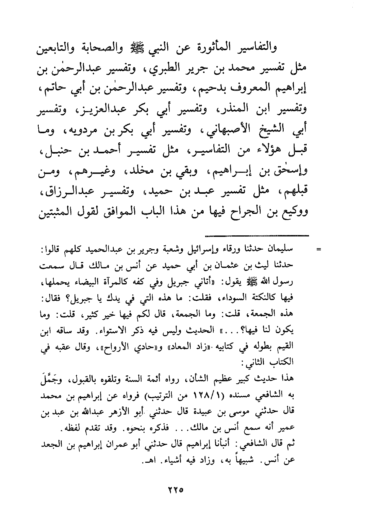 والتفاسير المأثورة عن النبي صلى الله عليه وسلم والصحابة والتابعين مثل تفسير محمد بن جرير الطبري، وتفسير عبد الرحمن بن إبراهيم المعروف بدحيم، وتفسير عبد الرحمن بن أبي حاتم، وتفسير ابن المنذر، وتفسير أبي بكر عبد العزيز، وتفسير أبي الشيخ الأصبهاني، وتفسير أبي بكر بن مردويه، وما قبل هؤلاء من التفاسير، مثل تفسير أحمد بن حنبل، وإسحاق بن إبراهيم، وبقي بن مخلد وغيرهم، ومن قبلهم مثل تفسير عبد بن حميد، وتفسير عبد الرزاق، ووكيع بن الجراح فيها من هذا الباب الموافق لقول المثبتين