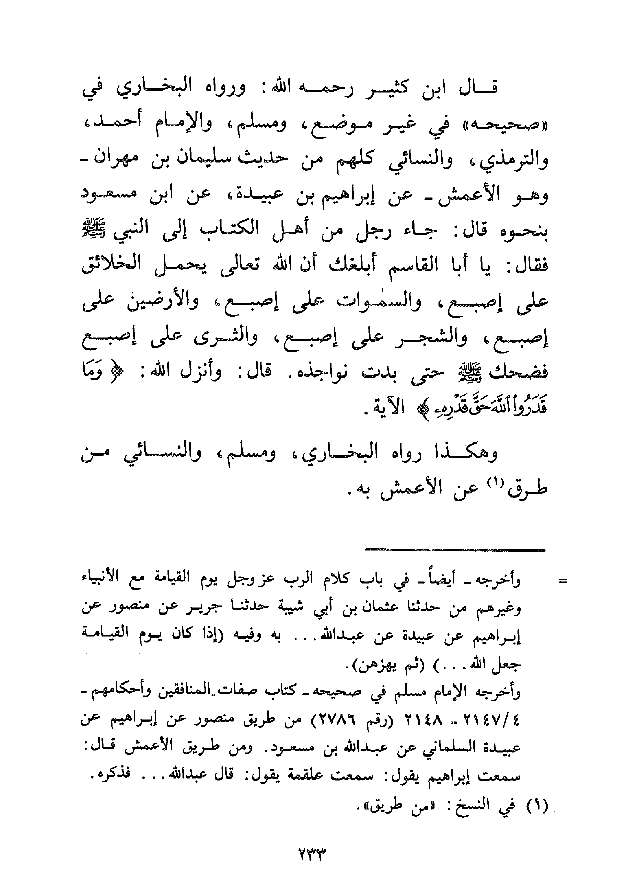 قال ابن كثير رحمه الله: ورواه البخاري في "صحيحه" في غير موضع، ومسلم، والإمام أحمد، والترمذي، والنسائي كلهم من حديث سليمان بن مهران –وهو الأعمش- عن إبراهيم بن عبيدة، عن ابن مسعود بنحوه قال: جاء رجل من أهل الكتاب إلى النبي صلى الله عليه وسلم فقال: يا أبا القاسم أبلغك أن الله تعالى يحمل الخلائق على إصبع، والسموات على إصبع، والأرضين على إصبع، والشجر على إصبع، والثرى على إصبع فضحك صلى الله عليه وسلم حتى بدت نواجذه. قال: وأنزل الله: {وَمَا قَدَرُوا اللَّهَ حَقَّ قَدْرِهِ} الآية.