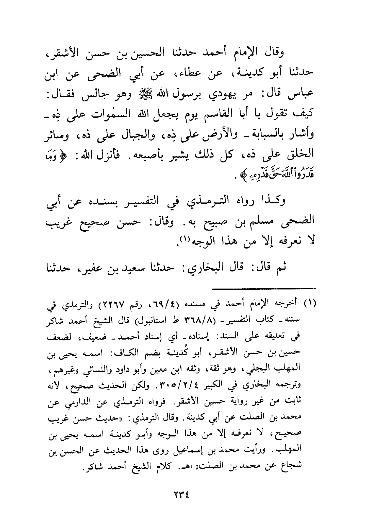 1 أخرجه الإمام أحمد في مسنده 4/69، رقم: 2267، والترمذي في سننه –كتاب التفسير- 8/368 ط استانبول، قال الشيخ أحمد شاكر في تعليقه على السند: إسناده –أي إسناد أحمد- ضعيف، لضعف حسين بن حسن الأشقر، أبو كدينة بضم الكاف: اسمه يحيى بن المهلب البجلي، وهو ثقة، وثقه ابن معين وأبو داود والنسائي وغيرهم، وترجمه البخاري في الكبير 4/2/305. ولكن الحديث صحيح، لأنه ثابت من غير وراية الأشقر. فرواه الترمذي عن الدارمي عن محمد بن الصلت عن أبي كدينة. وقال الترمذي: "حديث حسن غريب صحيح، لا نعرفه إلا من هذا الوجه، وأبو كدينة اسمه يحيى بن المهلب. ورأيت محمد بن إسماعيل روى هذا الحديث عن الحسن بن شجاع عن محمد بن الصلت" اهـ كلام الشيخ أحمد شاكر.