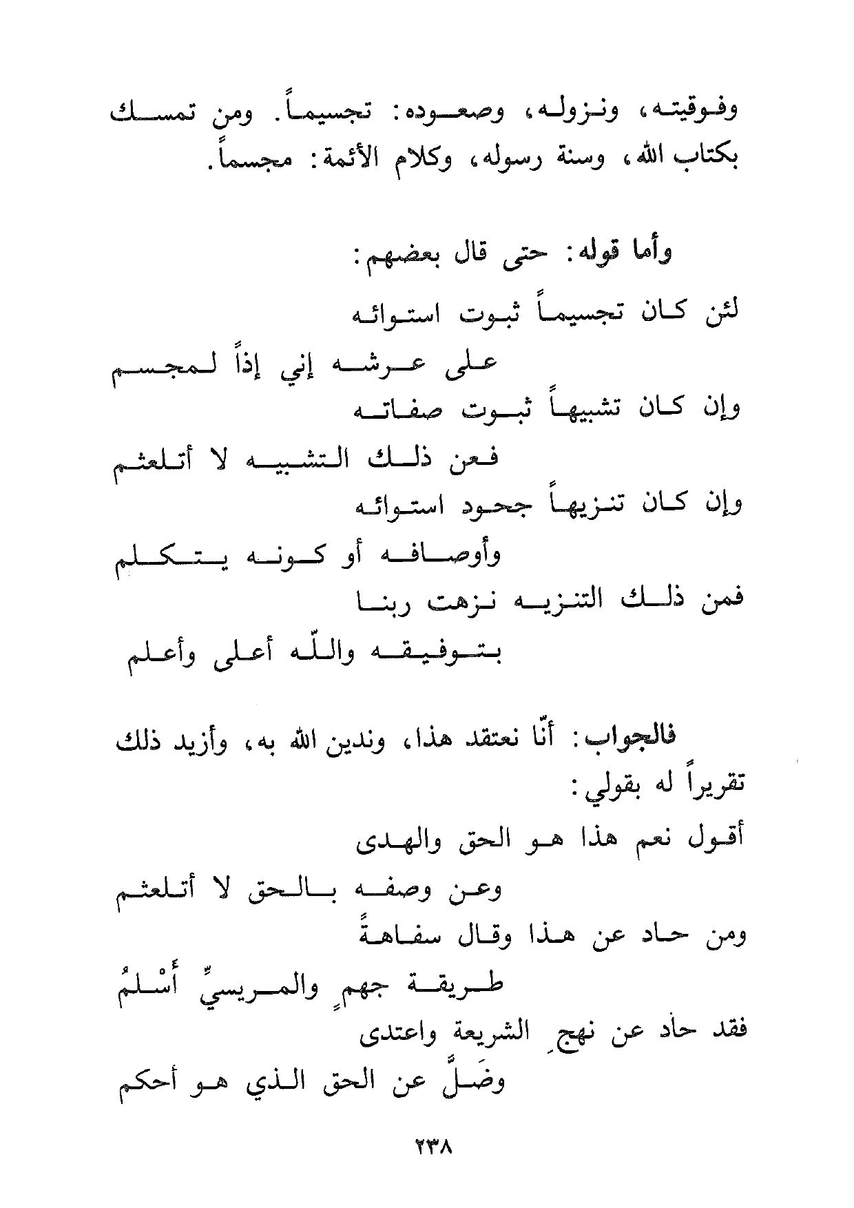 وفوقيته ونزوله وصعوده: تجسيماً ومن تمسك بكتاب الله وسنة رسوله، وكلام الأئمة: مجسماً.