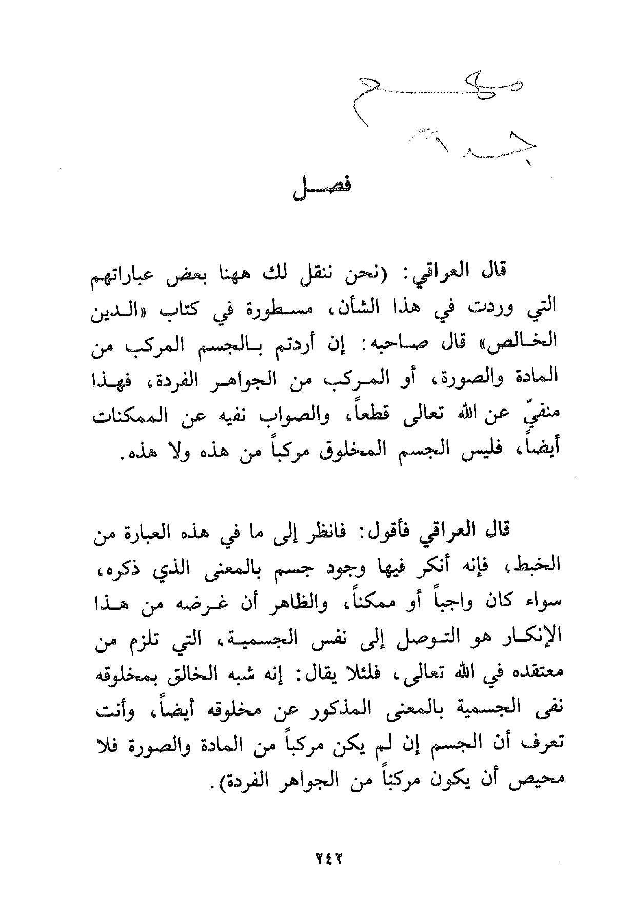 قال العراقي: (نحن ننقل لك ههنا بعض عباراتهم التي وردت في هذا الشأن، مسطورة في كتاب "الدين الخالص" قال صاحبه: إن أردتم بالجسم المركب من المادة والصورة، أو المركب من الجواهر الفردة، فهذا منفي عن الله تعالى قطعاً، والصواب نفيه عن الممكنات أيضاً، فليس الجسم المخلوق مركباً من هذه ولا هذه.