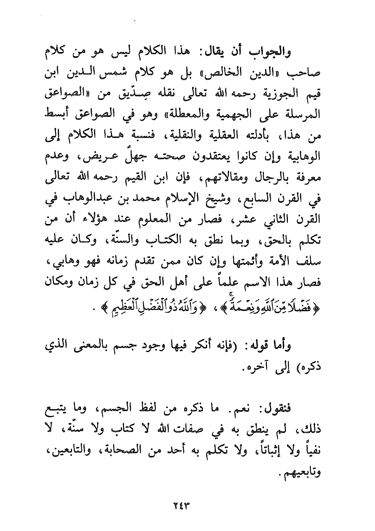 والجواب أن يقال: هذا الكلام ليس هو من كلام صاحب "الدين الخالص" بل هو كلام شمس الدين ابن قيم الجوزية رحمه الله تعالى نقله صديق من "الصواعق المرسلة على الجهمية والمعطلة" وهو في الصواعق أبسط من هذا، بأدلته العقلية والنقلية، فنسبة هذا الكلام إلى الوهابية وإن كانوا يعتقدون صحته جهل عريض، وعدم معرفة بالرجال ومقالاتهم، فإن ابن القيم رحمه الله تعالى في القرن السابع، وشيخ الإسلام محمد بن عبد الوهاب في القرن الثاني عشر، فصار من المعلوم عند هؤلاء أن من تكلم بالحق، وبما نطق به الكتاب والسنة، وكان عليه سلف الأمة وأئمتها وإن كان ممن تقدم زمانه فهو وهابي، فصار هذا الاسم علماً على أهل الحق في كل زمان ومكان {فَضْلاً مِنَ اللَّهِ وَنِعْمَة} ، {وَاللَّهُ ذُو الْفَضْلِ الْعَظِيمِ} .