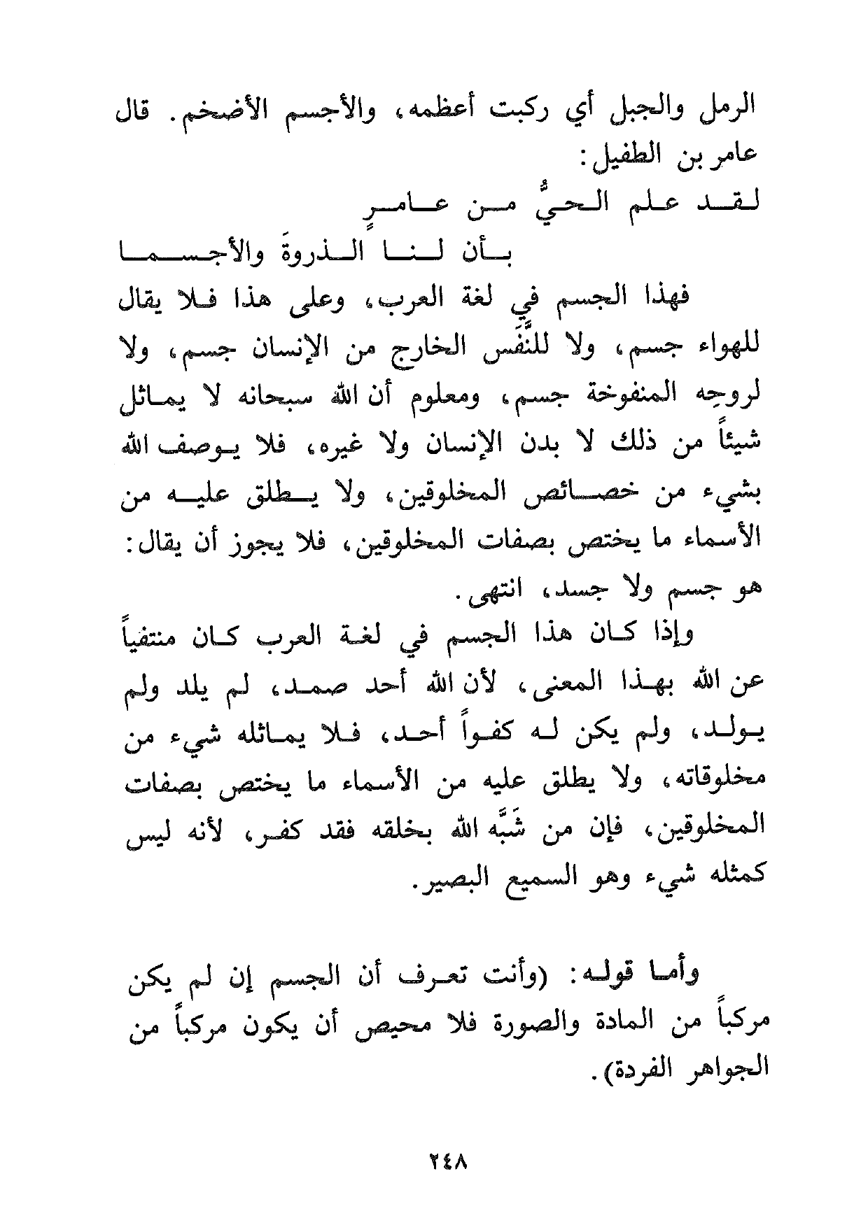 وإذا كان هذا الجسم في لغة العرب كان منتفياً عن الله بهذا المعنى، لأن الله أحد صمد، لم يلد ولم يولد، ولم يكن له كفواً أحد، فلا يماثله شيء من مخلوقاته، ولا يطلق عليه من الأسماء ما يختص بصفات المخلوقين، فإن من شبه الله بخلقه فقد كفر، لأنه ليس كمثله شيء وهو السميع البصير.
