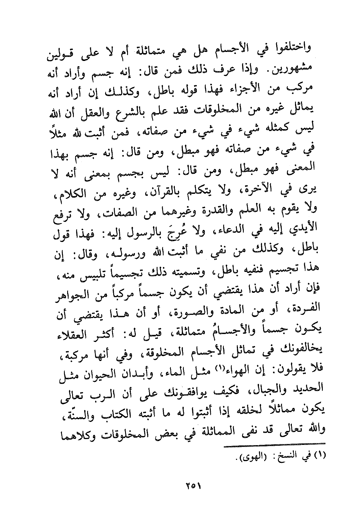 واختلفوا في الأجسام هل هي متماثلة أم لا على قولين مشهورين. وإذا عرف ذلك فمن قال: إنه جسم وأراد أنه مركب من الأجزاء فهذا قوله باطل، وكذلك إن أراد أنه يماثل غيره من المخلوقات فقد علم بالشرع والعقل أن الله ليس كمثله شيء في شيء من صفاته، فمن أثبت لله مثلاً في شيء من صفاته فهو مبطل، ومن قال: إنه جسم بهذا المعنى فهو مبطل، ومن قال: ليس بجسم بمعنى أنه لا يرى في الآخرة، ولا يتكلم بالقرآن، وغيره من الكلام، ولا يقوم به العلم والقدرة وغيرهما من الصفات، ولا ترفع الأيدي إليه في الدعاء، ولا عرج بالرسول إليه: فهذا قول باطل، وكذلك من نفى ما أثبت الله ورسوله، وقال: إن هذا تجسيم فنفيه باطل، وتسميته ذلك تجسيماً تلبيس منه، فإن أراد أن هذا يقتضي أن يكون جسماً مركباً من الجواهر الفردة، أو من المادة والصورة، أو أن هذا يقتضي أن يكون جسماً والأجسام متماثلة، قيل له: أكثر العقلاء يخالفونك في تماثل الأجسام المخلوقة، وفي أنها مركبة، فلا يقولون: إن الهواء1 مثل الماء، وأبدان الحيوان مثل الحديد والجبال، فكيف يوافقونك على أن الرب تعالى يكون مماثلاً لخلقه إذا أثبتوا له ما أثبته الكتاب والسنة، والله تعالى قد نفى الماثلة في بعض المخلوقات وكلاهما