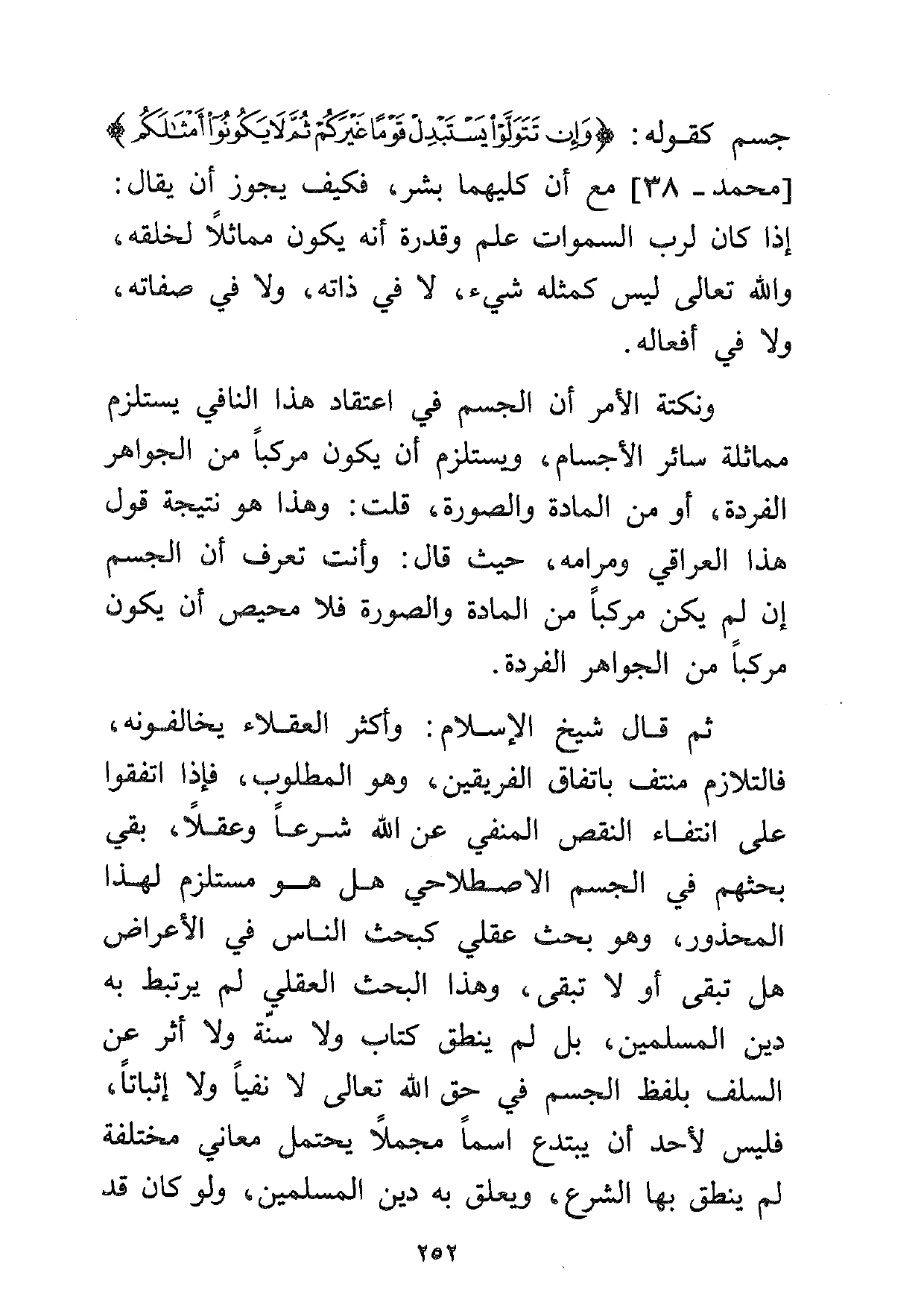 ثم قال شيخ الإسلام: وأكثر العقلاء يخالفونه، فالتلازم منتف باتفاق الفريقين، وهو المطلوب، فإذا اتفقوا على انتفاء النقص المنفي عن الله شرعاً وعقلاً، بقي بحثهم في الجسم الاصطلاحي هل هو مستلزم لهذا المحذور، وهو بحث عقلي كبحث الناس في الأعراض هل تبقى أو لا تبقى، وهذا البحث العقلي لم يرتبط به دين المسلمين، بل لم ينطق كتاب ولا سنة ولا أثر عن السلف بلفظ الجسم في حق الله تعالى لا نفياً ولا إثباتاً، فليس لأحد أن يبتدع اسماً مجملاً يحتمل معاني مختلفة لم ينطق بها الشرع، ويعلق به دين المسلمين، ولو كان قد