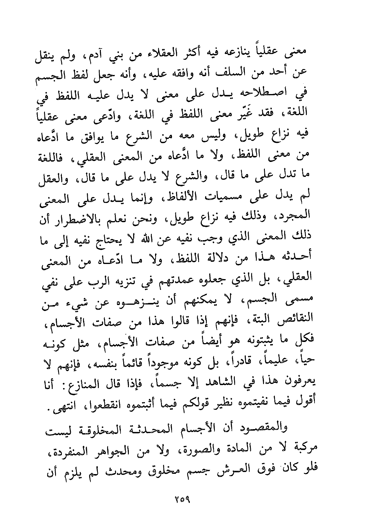 معنى عقلياً ينازعه فيه أكثر العقلاء من بني آدم، ولم ينقل عن أحد من السلف أنه وافقه عليه، وأنه جعل لفظ الجسم في اصطلاحه يدل على معنى لا يدل عليه اللفظ في اللغة، فقد غير معنى اللفظ في اللغة، وادعى معنى عقلياً فيه نزاع طويل، وليس معه من الشرع ما يوافق ما ادعاه من معنى اللفظ، ولا ما ادعاه من المعنى العقلي، فاللغة ما تدل على ما قال، والشرع لا يدل على ما قال، والعقل لم يدل على مسميات الألفاظ، وإنما يدل على المعنى المجرد وذلك فيه نزاع طويل، ونحن نعلم بالاضطرار إلى ذلك المعنى الذي وجب نفيه عن الله لا يحتاج نفيه إلى ما أحدثه هذا من دلالة اللفظ، ولا ما ادعاه من المعنى العقلي، بل الذي جعلوه عمدتهم في تنزيه الرب على نفي مسمى الجسم، لا يمكنهم أن ينزهوه عن شيء من النقائص البتة، فإنهم إذا قالوا هذا من صفات الأجسام، فكل ما يثبتونه هو أيضاً من صفات الأجسام، مثل كونه حياً عليماً قادراً بل كونه موجوداً قائماً بنفسه، فإنهم لا يعرفون هذا في الشاهد إلا جسماً، فإذا قال المنازع: أنا أقول فيما نفيتموه نظير قولكم فيما أثبتموه انقطعوا، انتهى.