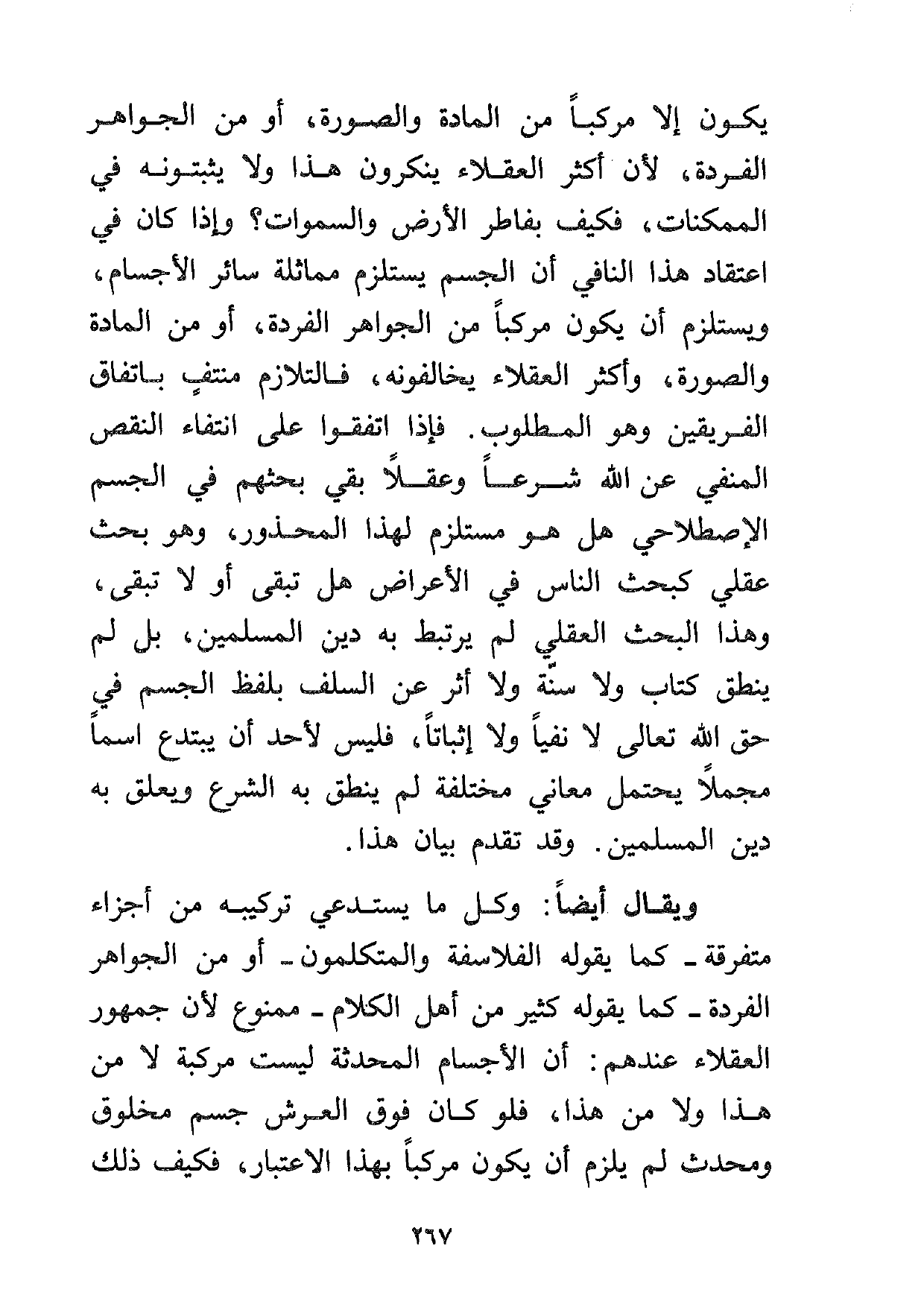 يكون إلا مركباً من المادة والصورة، أو من الجواهر الفردة، لأن أكثر العقلاء ينكرون هذا ولا يثبتونه في الممكنات، فكيف بفاطر الأرض والسموات؟ وإذا كان في اعتقاد هذا النافي أن الجسم يستلزم مماثلة سائر الأجسام، ويستلزم أن يكون مركباً من الجواهر الفردة، أو من المادة والصورة، وأكثر العقلاء يخالفونه، فالتلازم منتف باتفاق الفريقين وهو المطلوب. فإذا اتفقوا على انتفاء النقص المنفي عن الله شرعاً وعقلاً بقي بحثهم في الجسم الإصطلاحي هل هو مستلزم لهذا المحذور، وهو بحث عقلي كبحث الناس في الأعراض هل تبقى أو لا تبقى، وهذا البحث العقلي لم يرتبط به دين المسلمين، بل لم ينطق كتاب ولا سنة ولا أثر عن السلف بلفظ الجسم في حق الله تعالى لا نفياً ولا إثباتاً، فليس لأحد أن يبتدع اسماً مجملاً يحتمل معاني مختلفة لم ينطق به الشرع ويعلق به دين المسلمين. وقد تقدم بيان هذا.