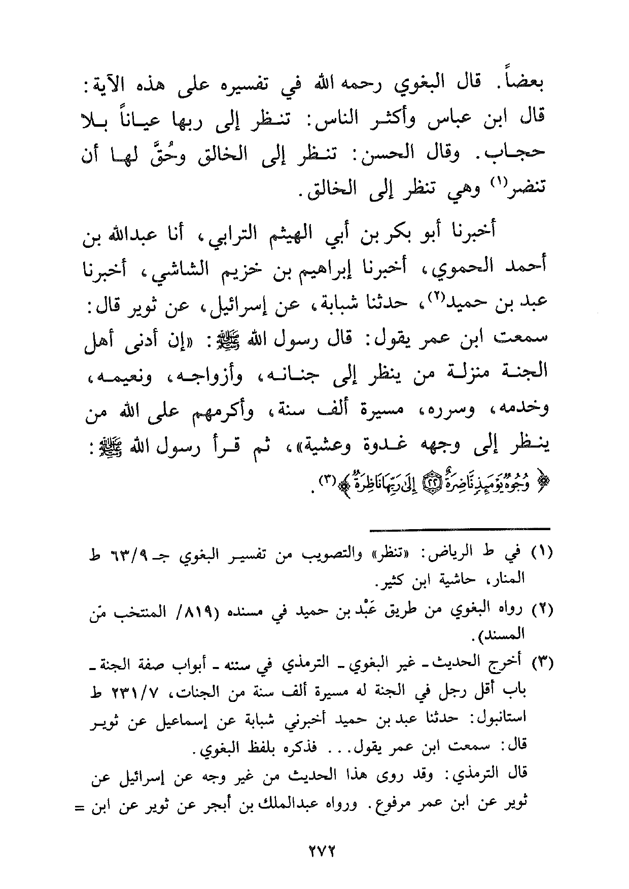 3 أخرج الحديث –غير البغوي- الترمذي في سننه –أبواب صفة الجنة- باب أقل رجل في الجنة له مسيرة ألف سنة من الجنات، 7/231 ط استانبول: حدثنا عبد بن حميد أخبرني شبابة عن إسماعيل عن ثوير قال: سمعت ابن عمر يقول ... فذكره بلفظ البغوي.