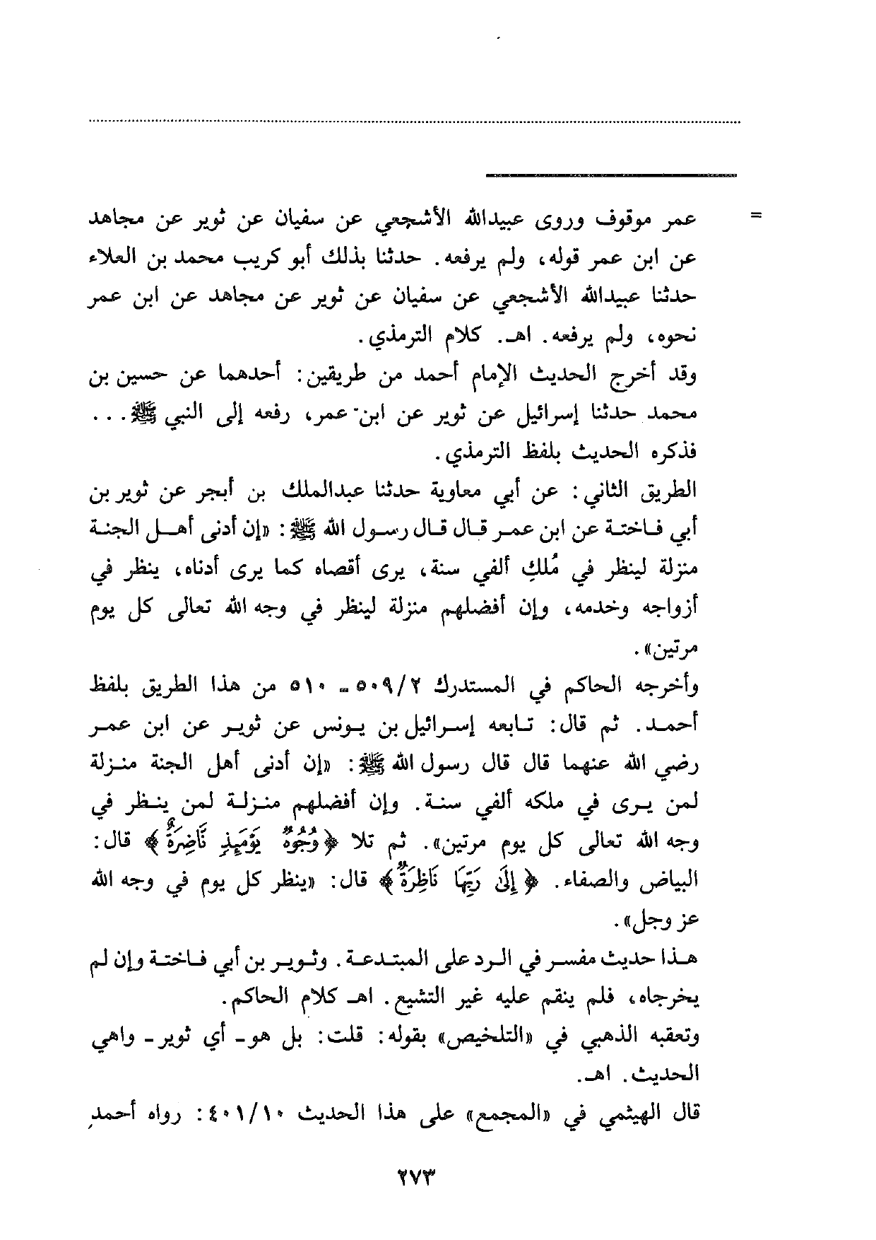 وأخرجه الحاكم في المستدرك 2/509-510 من هذا الطريق بلفظ أحمد. ثم قال: تابعه إسرائيل بن يونس عن ثوير عن ابن عمر رضي الله عنهما قال قال رسول الله صلى الله عليه وسلم: " إن أدنى أهل الجنة منزلة لمن يرى في ملكه ألفي سنة، وإن أفضلهم منزلة لمن ينظر في وجه الله تعالى كل يوم مرتين". ثم تلا: {وُجُوهٌ يَوْمَئِذٍ نَاضِرَةٌ} . قال: البياض والصفاء. {إِلَى رَبِّهَا نَاظِرَةٌ} قال: "ينظر كل يوم في وجه الله عز وجل".