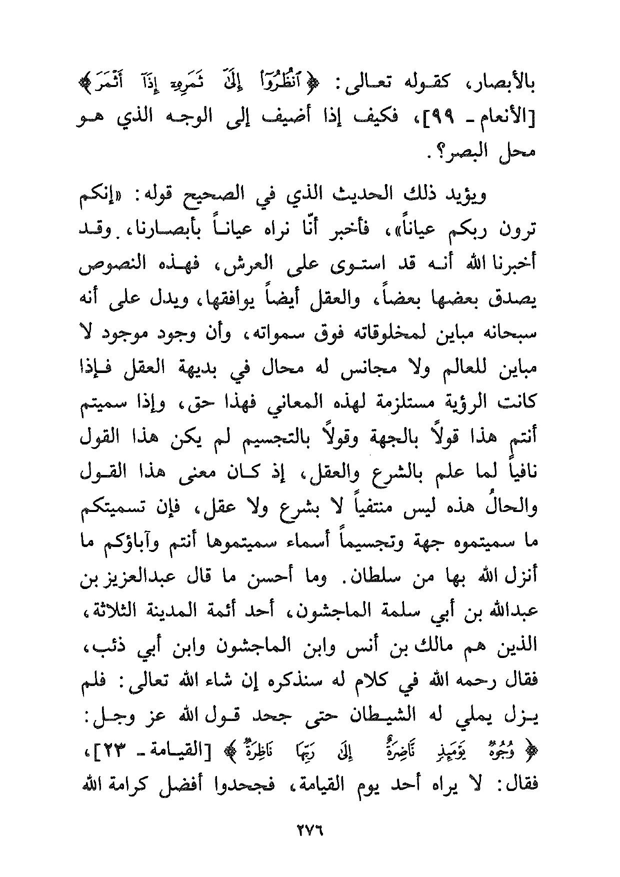 ويؤيد ذلك الحديث الذي في الصحيح قوله: "إنكم ترون ربكم عياناً"، فأخبر أنا نراه عياناً بأبصارنا، وقد أخبرنا الله أنه قد استوى على العرش، فهذه النصوص يصدق بعضها بعضاً، والعقل أيضاً يوافقها، ويدل على أنه سبحانه مباين لمخلوقاته فوق سمواته، وأن وجود موجود لا مباين للعالم ولا مجانس له محال في بديهة العقل، فإذا كانت الرؤية مستلزمة لهذه المعاني فهذا حق، وإذا سميتم أنتم هذا قولاً بالجهة وقولاً بالتجسيم لم يكن هذا القول نافياً لما علم بالشرع والعقل، إذ كان معنى هذا القول والحال هذه ليس منتفياً لا بشرع ولا عقل، فإن تسميتكم ما سميتموه جهة وتجسيماً أسماء سميتموها أنتم وآباؤكم ما أنزل الله بها من سلطان. وما أحسن ما قال عبد العزيز بن عبد الله بن أبي سلمة الماجشون، أحد أئمة المدينة الثلاثة، الذين هم: مالك بن أنس وابن الماجشون وابن أبي ذئب، فقال رحمه الله في كلام له سنذكره إن شاء الله تعالى: فلم يزل يملي له الشيطان حتى جحد قول الله عز وجل: {وُجُوهٌ يَوْمَئِذٍ نَاضِرَةٌ. إِلَى رَبِّهَا نَاظِرَةٌ} [القيامة:23] ، فقال: لا يراه أحد يوم القيامة، فجحدوا أفضل كرامة الله