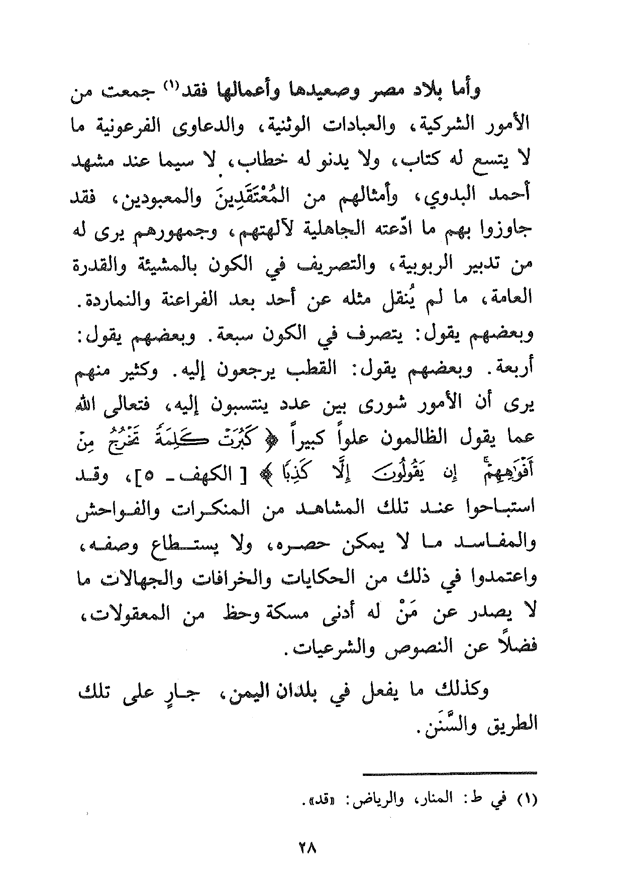 وأما بلاد مصر وصعيدها وأعمالها فقد1 جمعت من الأمور الشركية، والعبادات الوثنية، والدعاوي الفرعونية ما لا يتسع له كتاب، ولا يدنو له خطاب، لا سيما عند مشهد أحمد البدوي، وأمثالهم من المعتقدين والمعبودين، فقد جاوزوا بهم ما ادعته الجاهلية لآلهتهم، وجمهورهم يرى له من تدبير الربوبية، والتصريف في الكون بالمشيئة والقدرة العامة، ما لم ينقل مثله عن أحد بعد الفراعنة والنماردة.