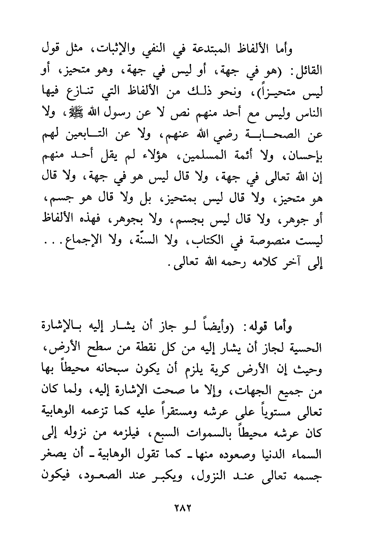 وأما الألفاظ المبتدعة في النفي والإثبات، مثل قول القائل: (هو في جهة، أو ليس في جهة، وهو متحيز، أو ليس متحيزاً) ، ونحو ذلك من الألفاظ التي تنازع فيها الناس وليس مع أحد منهم نص لا عن رسول الله صلى الله عليه وسلم، ولا عن الصحابة رضي الله عنهم، ولا عن التابعين لهم بإحسان، ولا أئمة المسلمين، هؤلاء لم يقل أحد منهم إن الله تعالى في جهة، ولا قال ليس هو في جهة، ولا قال هو متحيز، ولا قال ليس بمتحيز، بل ولا قال هو جسم أو جوهر، ولا قال ليس بجسم ولا بجوهر، فهذه الألفاظ ليست منصوصة في الكتاب، ولا السنة، ولا الإجماع ... إلى آخر كلامه رحمه الله تعالى.