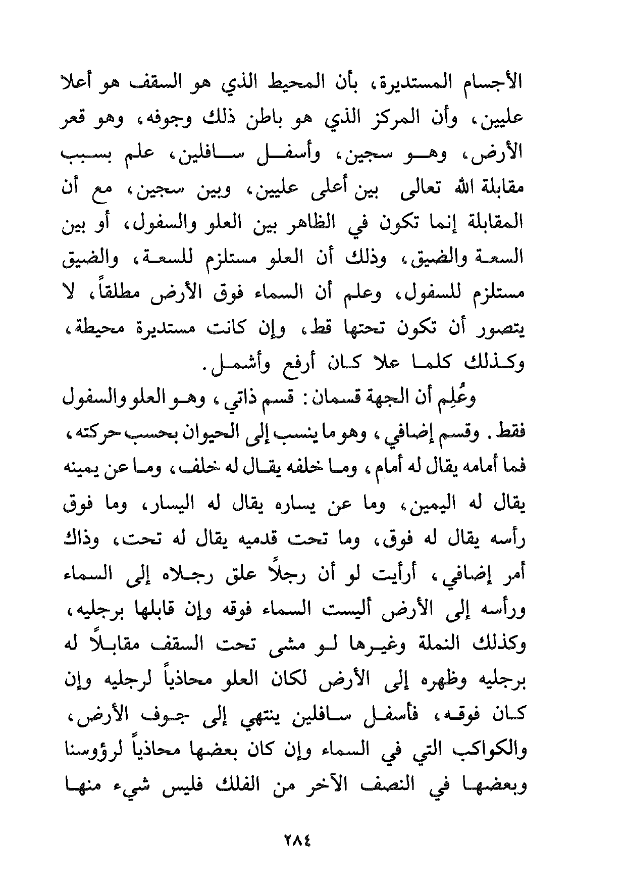 وعلم أن الجهة قسمان: قسم ذاني، وهو العلو والسفول فقط. وقسم إضافي، وهو ما ينسب إلى الحيوان بحسب حركته، فما أمامه يقال له أمام، وما خلفه يقال له خلف، وما عن يمينه يقال له اليمين، وما عن يساره يقال له اليسار، وما فوق رأسه يقال له فوق، وما تحت قدميه يقال له تحت، وذاك أمر إضافي، أرأيت لو أن رجلاً علق رجلاه إلى السماء ورأسه إلى الأرض، أليست السماء فوقه وإن قابلها برجليه، وكذلك النملة وغيرها لو مشى تحت السقف مقابلاً له برجليه وظهره إلى الأرض لكان العلو محاذياً لرجليه وإن كان فوقه، فأسفل سافلين ينتهي إلى جوف الأرض، والكواكب التي في السماء وإن كان بعضها محاذياً لرؤوسنا وبعضها في النصف الآخر من الفلك فليس شيء منها