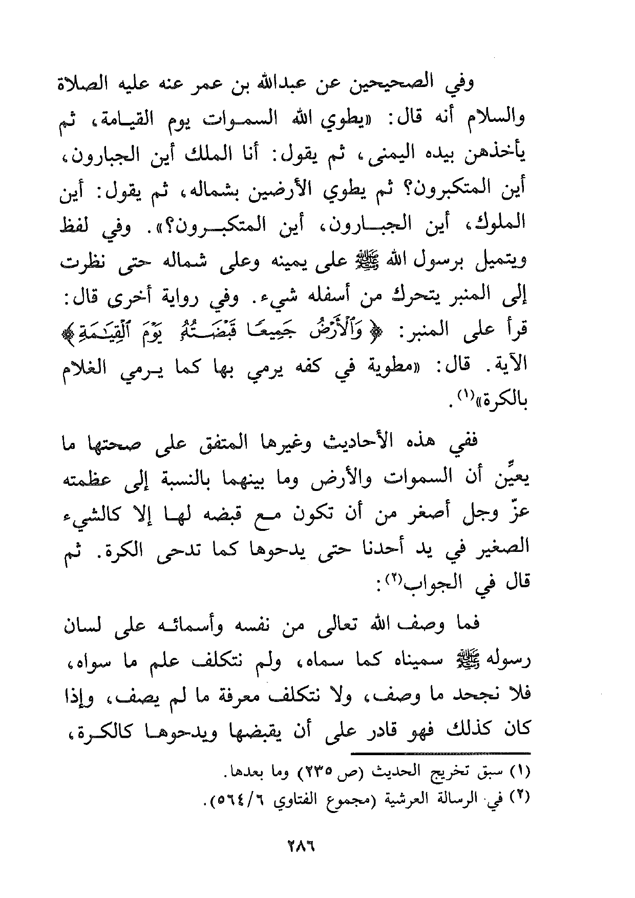 ففي هذه الأحاديث وغيرها المتفق على صحتها ما يعين أن السموات والأرض وما بينهما بالنسبة إلى عظمته عز وجل أصغر من أن تكون مع قبضه لها إلا كالشيء الصغير في يد أحدنا حتى يدحوها كما تدحى الكرة. ثم قال في الجواب2: