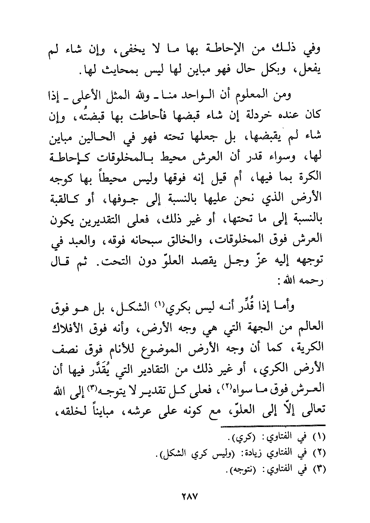 وأما إذا قدر أنه ليس بكري1 الشكل، بل هو فوق العالم من الجهة التي هي وجه الأرض، وأنه فوق الأفلاك الكرية، كما أن وجه الأرض الموضوع للأنام فوق نصف الأرض الكري، أو غير ذلك من التقادير التي يقدر فيها أن العرش فوق ما سواه2، فعلى كل تقدير لا يتوجه3 إلى الله تعالى إلا إلى العلو، مع كونه على عرشه، مبايناً لخلقه،