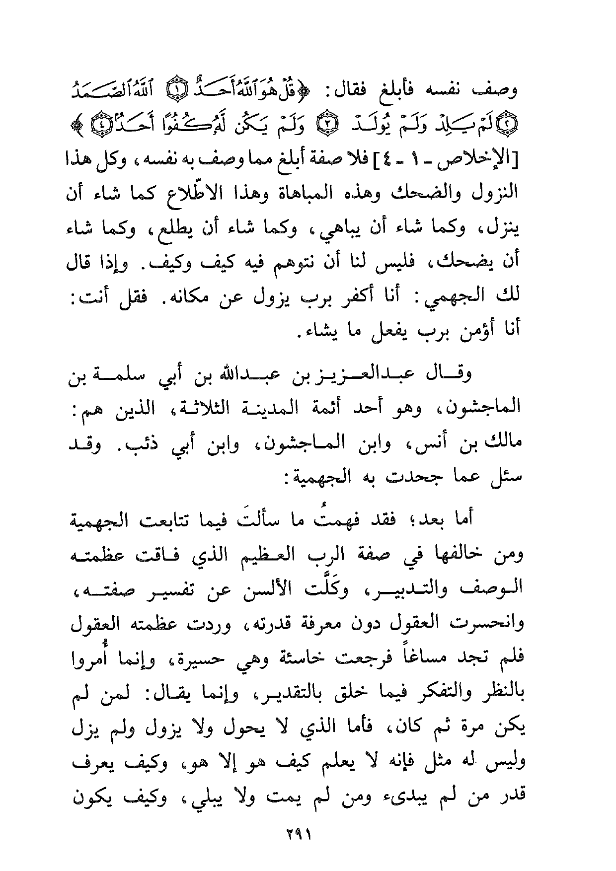 وقال عبد العزيز بن عبد الله بن أبي سلمة بن الماجشون، وهو أحد أئمة المدينة الثلاثة، الذين هم: مالك بن أنس، وابن الماجشون، وابن أبي ذئب، وقد سئل عما جحدت الجهمية: