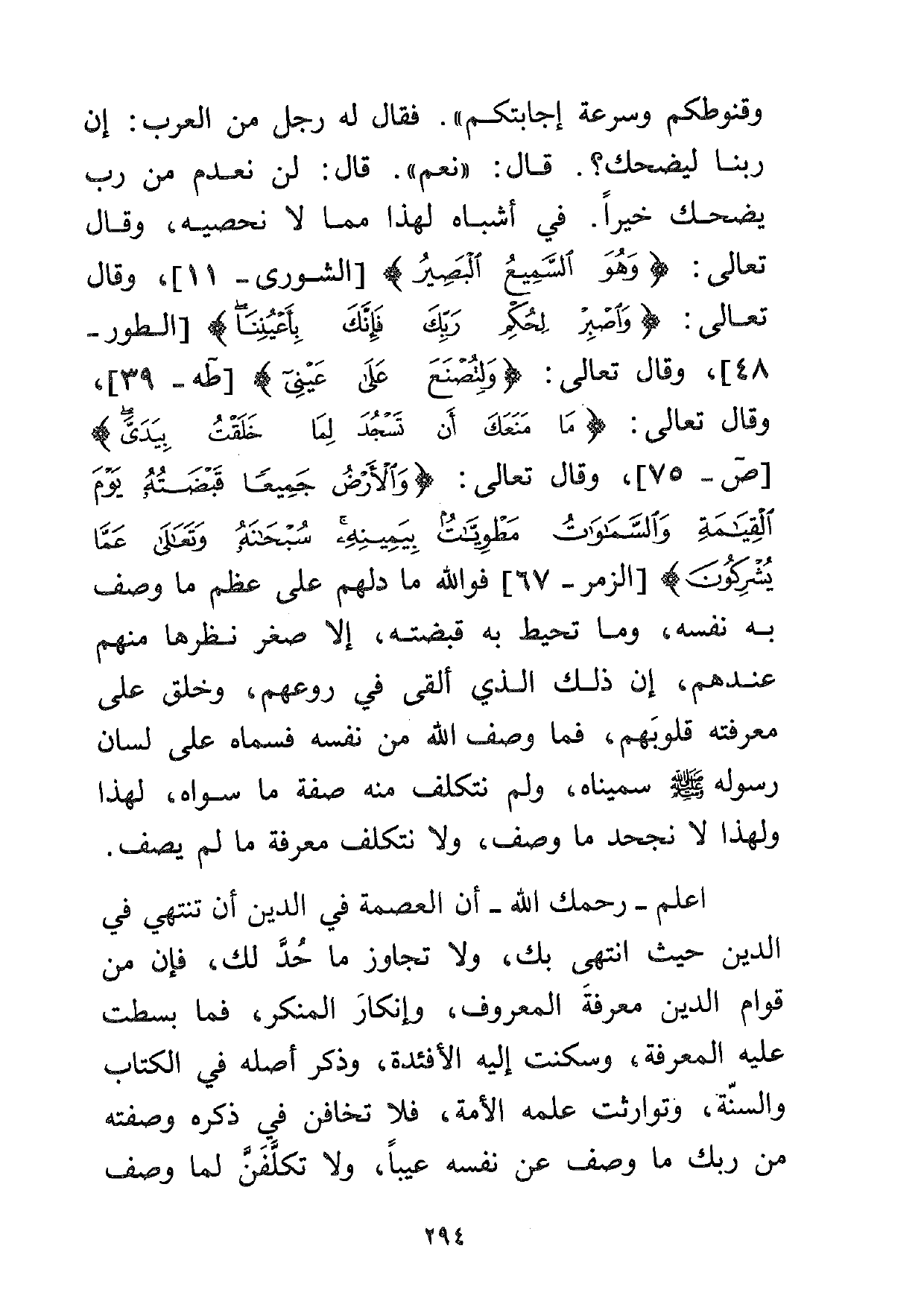 اعلم –رحمك الله- أن العصمة في الدين أن تنتهي في الدين حيث انتهى بك، ولا تجاوز ما حد لك، فإن من قوام الدين معرفة المعروف، وإنكار المنكر، فما بسطت عليه المعرفة، وسكنت إليه الأفئدة، وذكر أصله في الكتاب والسنة، وتوارثت علمه الأمة، فلا تخافن في ذكره وصفته من ربك ما وصف عن نفسه عيباً، ولا تكلفن لما وصف