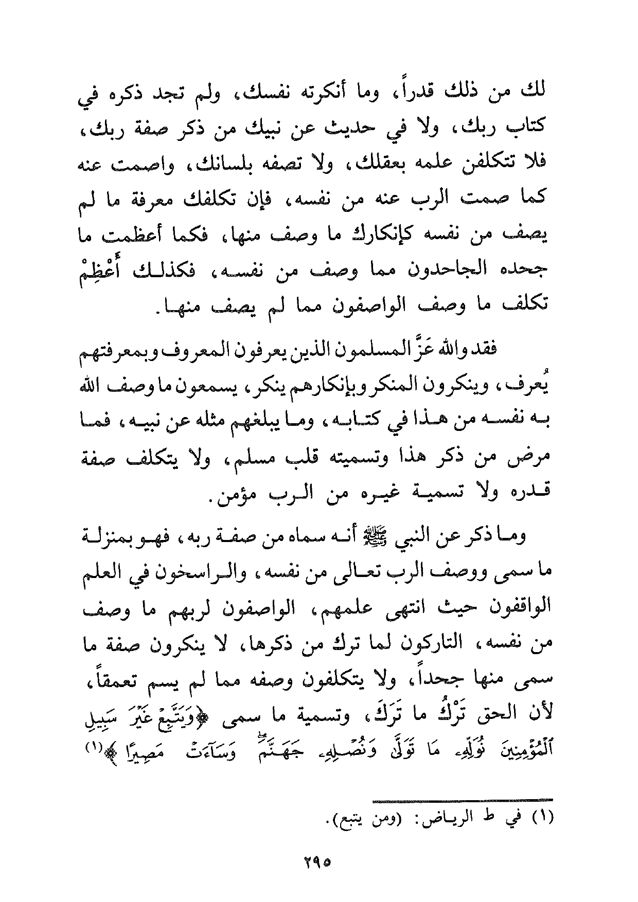 وما ذكر عن النبي صلى الله عليه وسلم أنه سماه من صفة ربه، فهو بمنزلة ما سمى ووصف الرب تعالى من نفسه، والراسخون في العلم الواقفون حيث انتهى علمهم، الواصفون لربهم ما وصف من نفسه، التاركون لما ترك من ذكرها، لا ينكرون صفة ما سمى منها جحداً، ولا يتكلفون وصفه مما لم يسم تعمقاً، لأن الحق ترك ما ترك، وتسمية ما سمى: {وَيَتَّبِعْ غَيْرَ سَبِيلِ الْمُؤْمِنِينَ نُوَلِّهِ مَا تَوَلَّى وَنُصْلِهِ جَهَنَّمَ وَسَاءَتْ مَصِيراً} 1