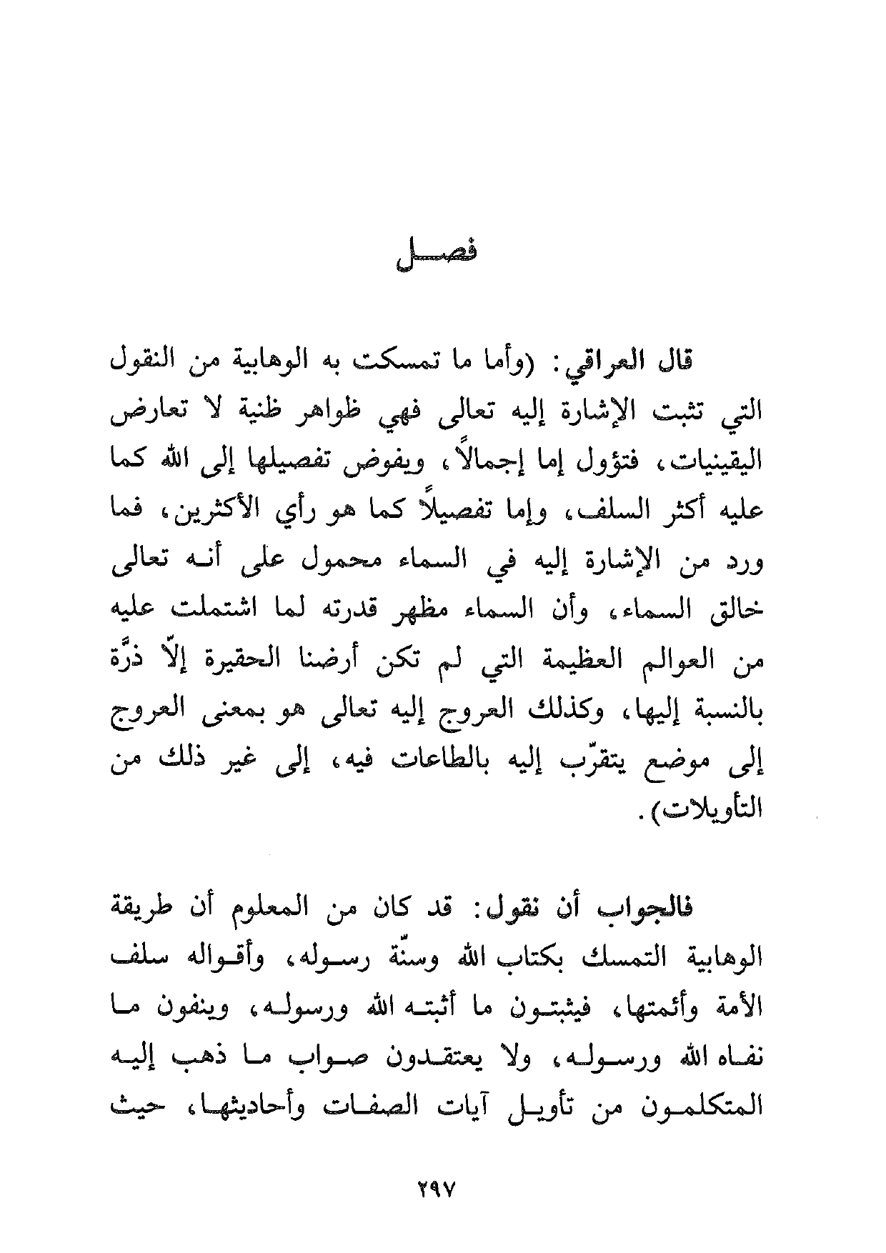 قال العراقي: (وأما ما تمسكت به الوهابية من النقول التي تثبت الإشارة إليه تعالى فهي ظواهر ظنية لا تعارض اليقينيات، فتؤول إما إجمالاً، ويفوض تفصيلها إلى الله كما عليه أكثر السلف، وإما تفصيلاً كما هو رأي الأكثرين، فما ورد من الإشارة إليه في السماء محمول على أنه تعالى خالق السماء، وأن السماء مظهر قدرته لما اشتملت عليه من العوالم العظيمة التي لم تكن أرضنا الحقيرة إلا ذرة بالنسبة إليها، وكذلك العروج إليه تعالى هو بمعنى العروج إلى موضع يتقرب إليه بالطاعات فيه، إلى غير ذلك من التأويلات) .