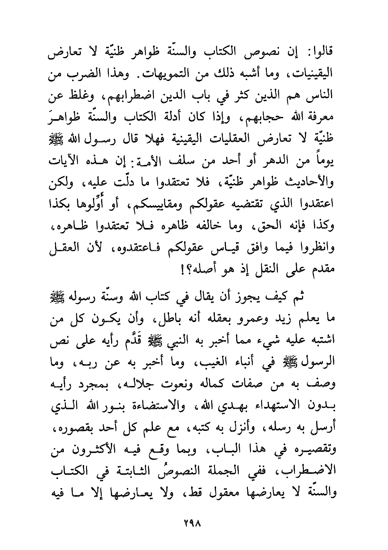 ثم كيف يجوز أن يقال في كتاب الله وسنة رسوله صلى الله عليه وسلم ما يعلم زيد وعمرو بعقله أنه باطل، وأن يكون كل من اشتبه عليه شيء مما أخبر به النبي صلى الله عليه وسلم قدم رأيه على نص الرسول صلى الله عليه وسلم في أنباء الغيب، وما أخبر به عن ربه، وما وصف به من صفات كماله ونعوت جلاله، بمجرد رأيه بدون الاستهداء بهدي الله، والاستضاءة بنور الله الذي أرسل به رسله، وأنزل به كتبه، مع علم كل أحد بقصوره، وتقصيره في هذا الباب، وبما وقع فيه الأكثرون من الاضطراب، ففي الجملة النصوص الثابتة في الكتاب والسنة لا يعارضها معقول قط، ولا يعارضها إلا ما فيه