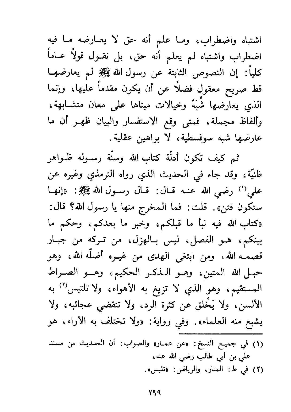 ثم كيف تكون أدلة كتاب الله وسنة رسوله ظواهر ظنية، وقد جاء في الحديث الذي رواه الترمذي وغيره عن علي1 رضي الله عنه قال: قال رسول الله صلى الله عليه وسلم: "إنها ستكون فتن" قلت: فما المخرج منها يا رسول الله؟ قال: "كتاب الله فيه نبأ ما قبلكم، وخبر ما بعدكم، وحكم ما بينكم، هو الفصل، ليس بالهزل، من تركه من جبار قصمه الله، ومن ابتغى الهدى من غيره أضله الله، وهو حبل الله المتين، وهو الذكر الحكيم، وهو الصراط المستقيم، وهو الذي لا تزيغ به الأهواء، ولا تلتبس2 به الألسن، ولا يخلق عن كثرة الرد، ولا تنقضي عجائبة، ولا يشبع منه العلماء ". وفي رواية: "ولا تختلف به الآراء، هو