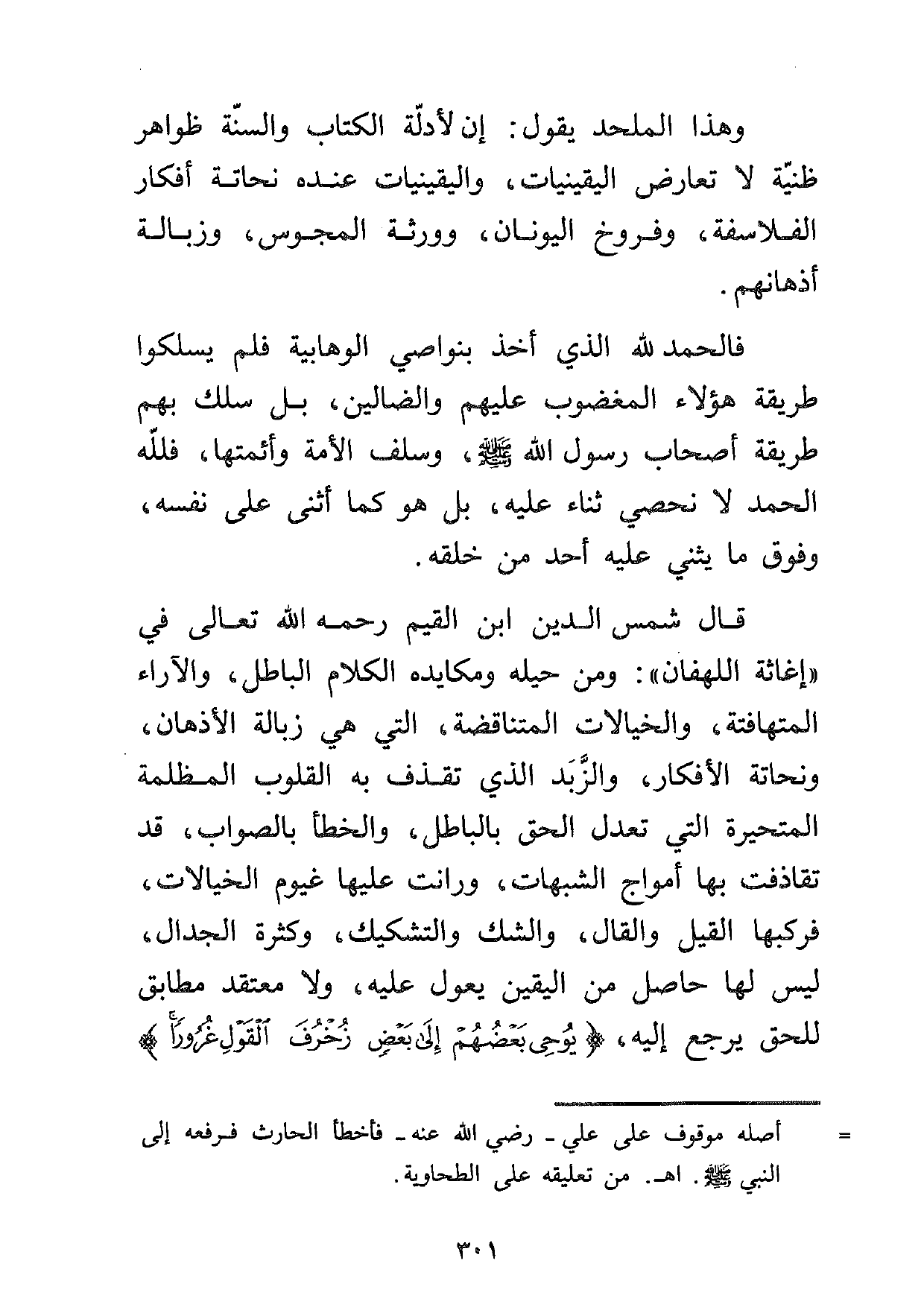 فالحمد لله الذي أخذ بنواصي الوهابية فلم يسكلوا طريقة هؤلاء المغضوب عليهم والضالين، بل سلك بهم طريقة أصحاب رسول الله صلى الله عليه وسلم، وسلف الأمة وأئمتها، فلله الحمد لا نحصي ثناء عليه، بل هو كما أثنى على نفسه، وفوق ما يثني عليه أحد من خلقه.