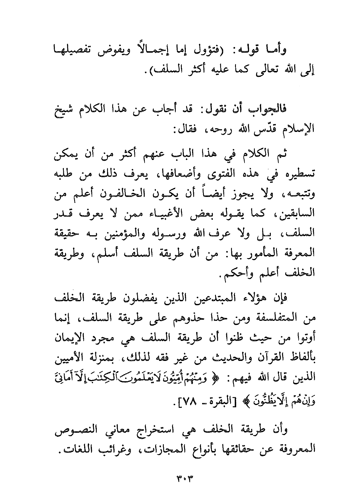 فإن هؤلاء المبتدعين الذين يفضلون طريقة الخلف من المتفلسفة ومن حذا حذوهم على طريقة السلف، إنما أوتوا من حيث ظنوا أن طريقة السلف هي مجرد الإيمان بألفاظ القرآن والحديث من غير فقه لذلك، بمنزلة الأميين الذين قال الله فيهم: {وَمِنْهُمْ أُمِّيُّونَ لا يَعْلَمُونَ الْكِتَابَ إِلَّا أَمَانِيَّ وَإِنْ هُمْ إِلَّا يَظُنُّونَ} [البقرة: 78] .