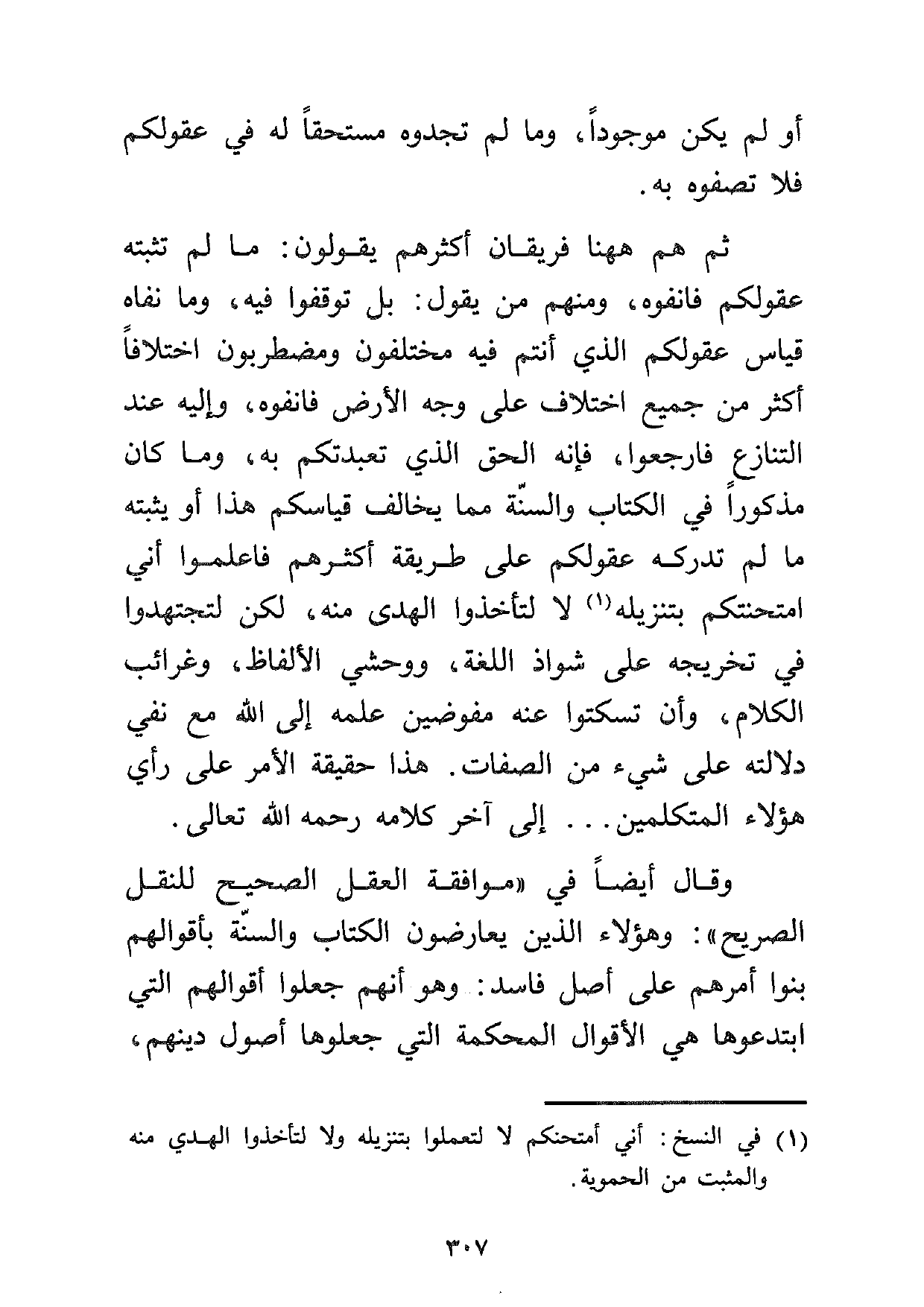 ثم هم ههنا فريقان أكثرهم يقولون: ما لم تثبته عقولكم فانفوه، ومنهم من يقول: بل توقفوا فيه، وما نفاه قياس عقولكم الذي أنتم فيه مختلفون ومضطربون اختلافاً أكثر من جميع الاختلاف على وجه الأرض فانفوه، وإليه عند التنازع فارجعوا، فإنه الحق الذي تعبدتكم به، وما كان مذكوراً في الكتاب والسنة مما يخالف قياسكم هذا أو يثبته ما لم تدركه عقولكم على طريقة أكثرهم فاعلموا أني امتحنتكم بتنزيله1 لا لتأخذوا الهدى منه، لكن لتجتهدوا في تخريجه على شواذ اللغة، ووحشي الألفاظ، وغرائب الكلام، وأن تسكتوا عنه مفوضين علمه إلى الله مع نفي دلالته على شيء من الصفات. هذا حقيقة الأمر على رأي هؤلاء المتكلمين ... إلى آخر كلامه رحمه الله تعالى.