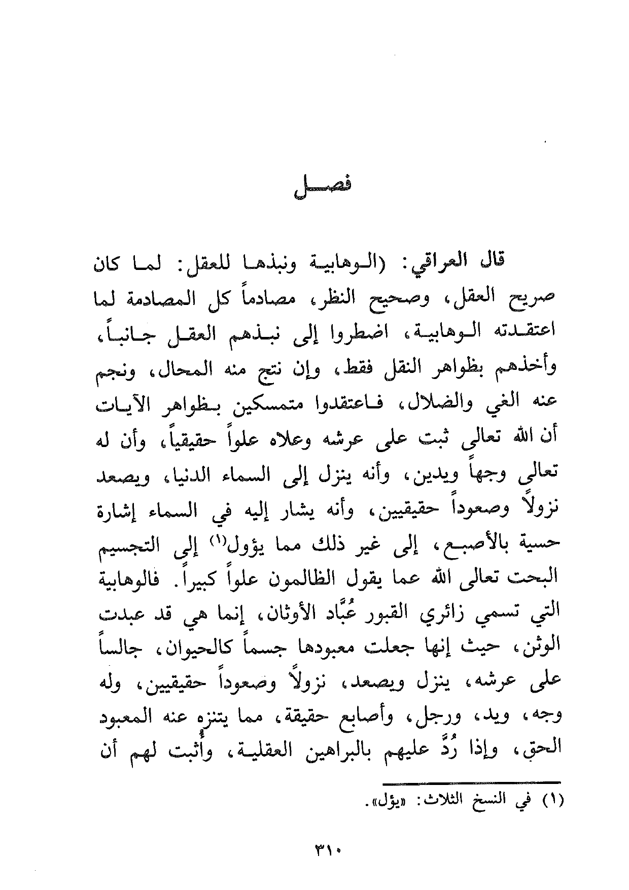 قال العراقي: (الوهابية ونبذها للعقل: لما كان صريح العقل، وصحيح النظر، مصادماً كل المصادمة لما اعتقدته الوهابية، اضطروا إلى نبذهم العقل جانباً، وأخذهم بظواهر النقل فقط، وإن نتج منه المحال، ونجم عنه الغي والضلال، فاعتقدوا متمسكين بظواهر الآيات أن الله تعالى ثبت على عرشه وعلاه علواً حقيقياً، وأن له تعالى وجهاً ويدين، وأنه ينزل إلى السماء الدنيا، ويصعد نزولاً وصعوداً حقيقيين، وأنه يشار إليه في السماء إشارة حسية بالأصبع، إلى غير ذلك مما يؤول1 إلى التجسيم البحت تعالى الله عما يقول الظالمون علواً كبيراً. فالوهابية التي تسمي زائري القبور عباد الأوثان، إنما هي قد عبدت الوثن، حيث إنها جعلت معبودها جسماً كالحيوان، جالساً على عرشه، ينزل ويصعد، نزولاً وصعوداً حقيقيين، وله وجه ويد ورجل وأصابع حقيقة، مما يتنزه عنه المعبود الحق، وإذا رد عليهم بالبراهين العقلية، وأثبت لهم أن
