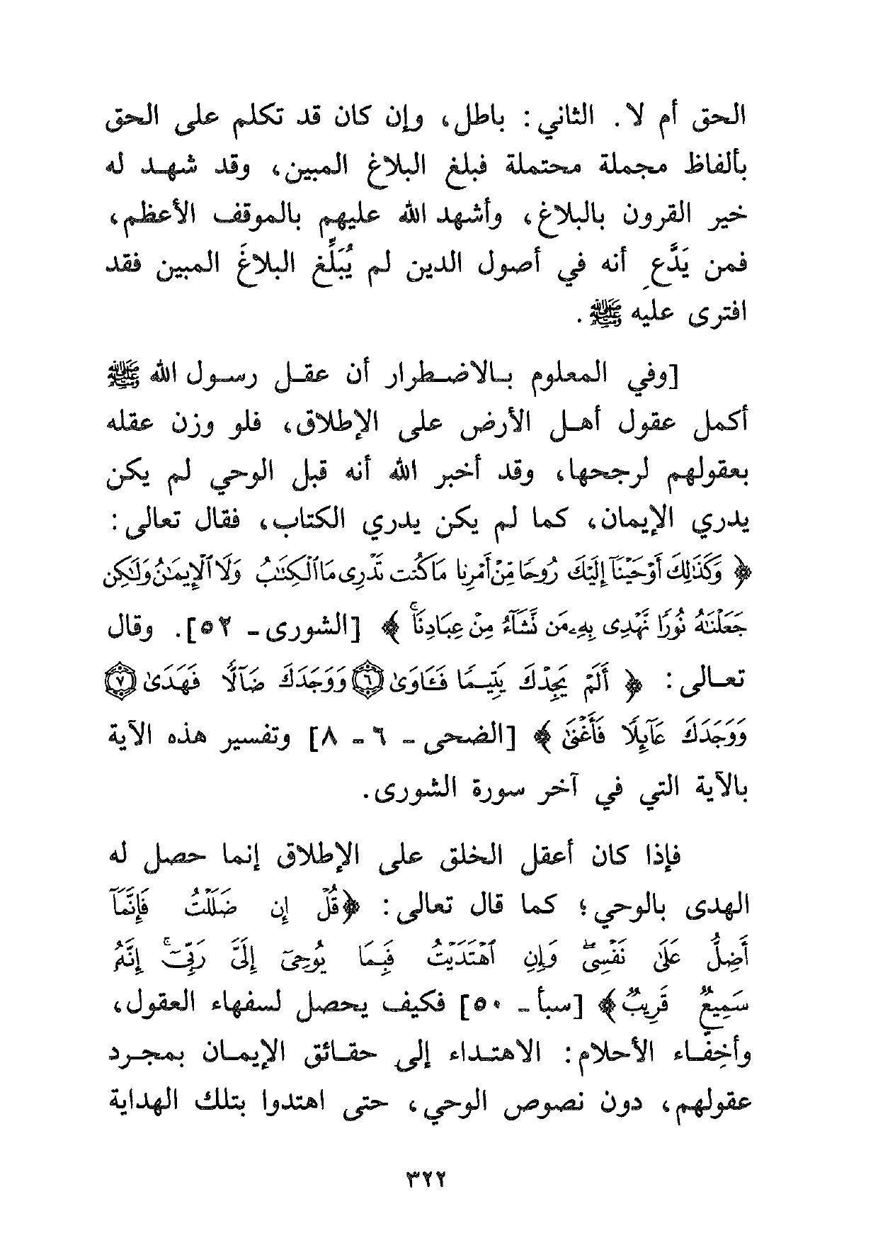 [وفي المعلوم بالاضطرار أن عقل رسول الله صلى الله عليه وسلم أكمل عقول أهل الأرض على الإطلاق، فلو وزن عقله بعقولهم لرجحها، وقد أخبر الله أنه قبل الوحي لم يكن يدري الإيمان، كما لم يكن يدري الكتاب، فقال تعالى: {وَكَذَلِكَ أَوْحَيْنَا إِلَيْكَ رُوحاً مِنْ أَمْرِنَا مَا كُنْتَ تَدْرِي مَا الْكِتَابُ وَلا الْأِيمَانُ وَلَكِنْ جَعَلْنَاهُ نُوراً نَهْدِي بِهِ مَنْ نَشَاءُ مِنْ عِبَادِنَا} [الشورى: 52] . وقال تعالى: {أَلَمْ يَجِدْكَ يَتِيماً فَآوَى. وَوَجَدَكَ ضَالاً فَهَدَى. وَوَجَدَكَ عَائِلاً فَأَغْنَى} [الضحى: 6-8] وتفسير هذه الآية بالآية التي في آخر سورة الشورى.