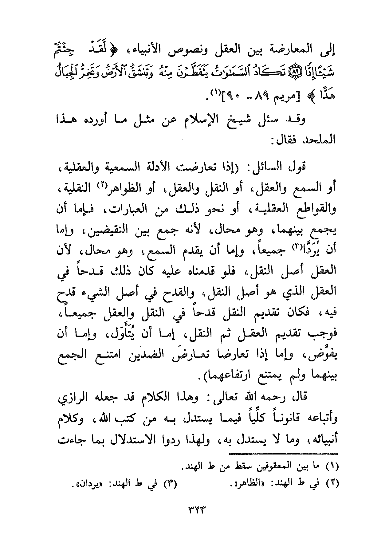 إلى المعارض بين العقل ونصوص الأنبياء {لَقَدْ جِئْتُمْ شَيْئاً إِدّاً. تَكَادُ السَّمَاوَاتُ يَتَفَطَّرْنَ مِنْهُ وَتَنْشَقُّ الْأَرْضُ وَتَخِرُّ الْجِبَالُ هَدّاً} [مريم:89-90] 1.