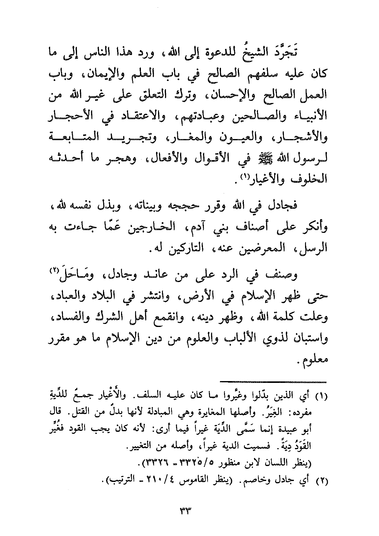 تجرد الشيخ للدعوة إلى الله، ورد هذا الناس إلى ما كان عليه سلفهم الصالح في باب العلم والإيمان، وباب العمل الصالح والإحسان، وترك التعلق على غير الله من الأنبياء والصالحين وعبادتهم، والاعتقاد في الأحجار والأشجار، والعيون والمغار، وتجريد المتابعة لرسول الله صلى الله عليه وسلم في الأقوال والأفعال، وهجر ما أحدثه الخلوف والأغيار1.