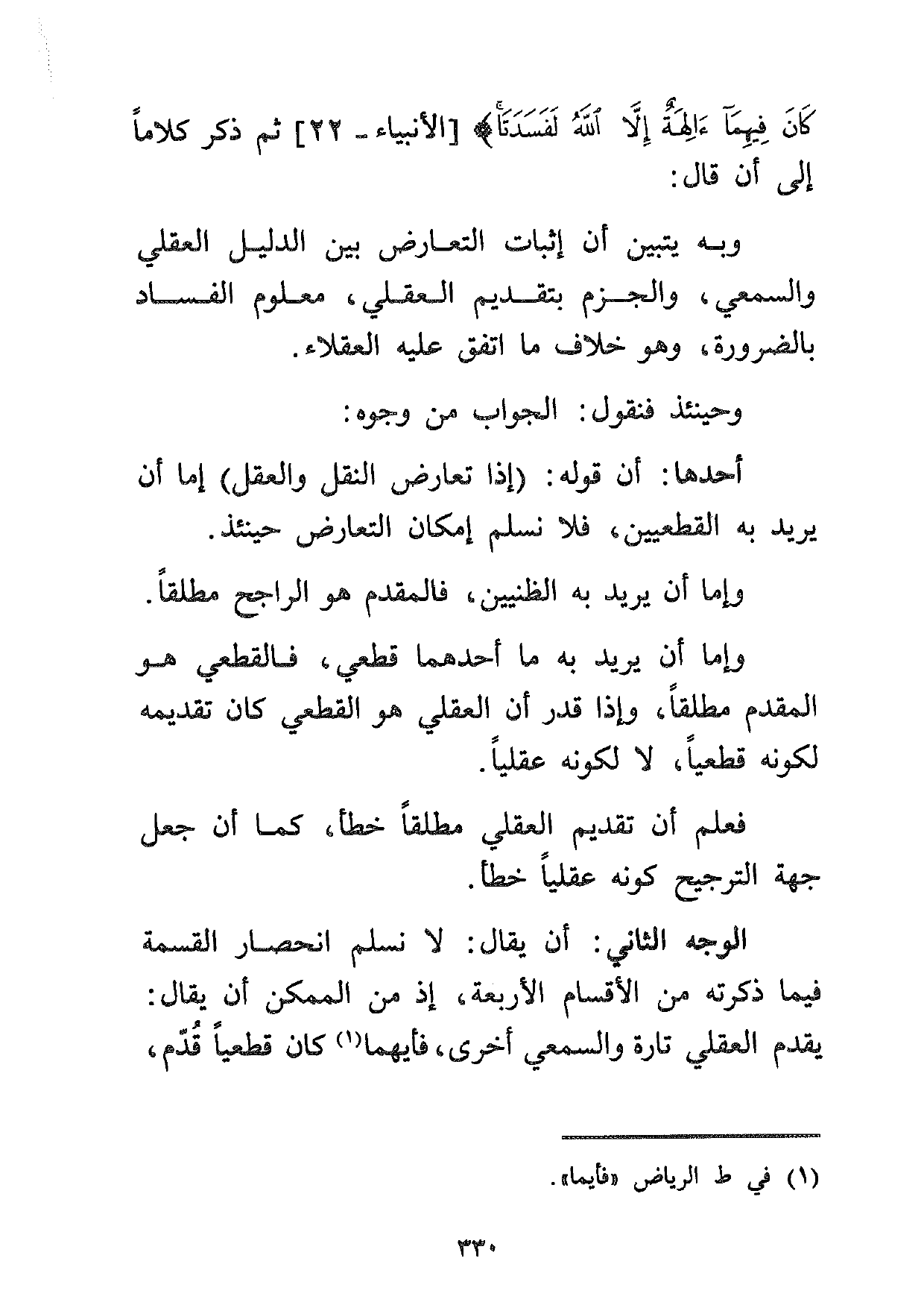 أحدها: أن قوله: (إذا تعارض النقل والعقل) إما أن يريد به القطعيين، فلا نسلم إمكان التعارض حينئذ.