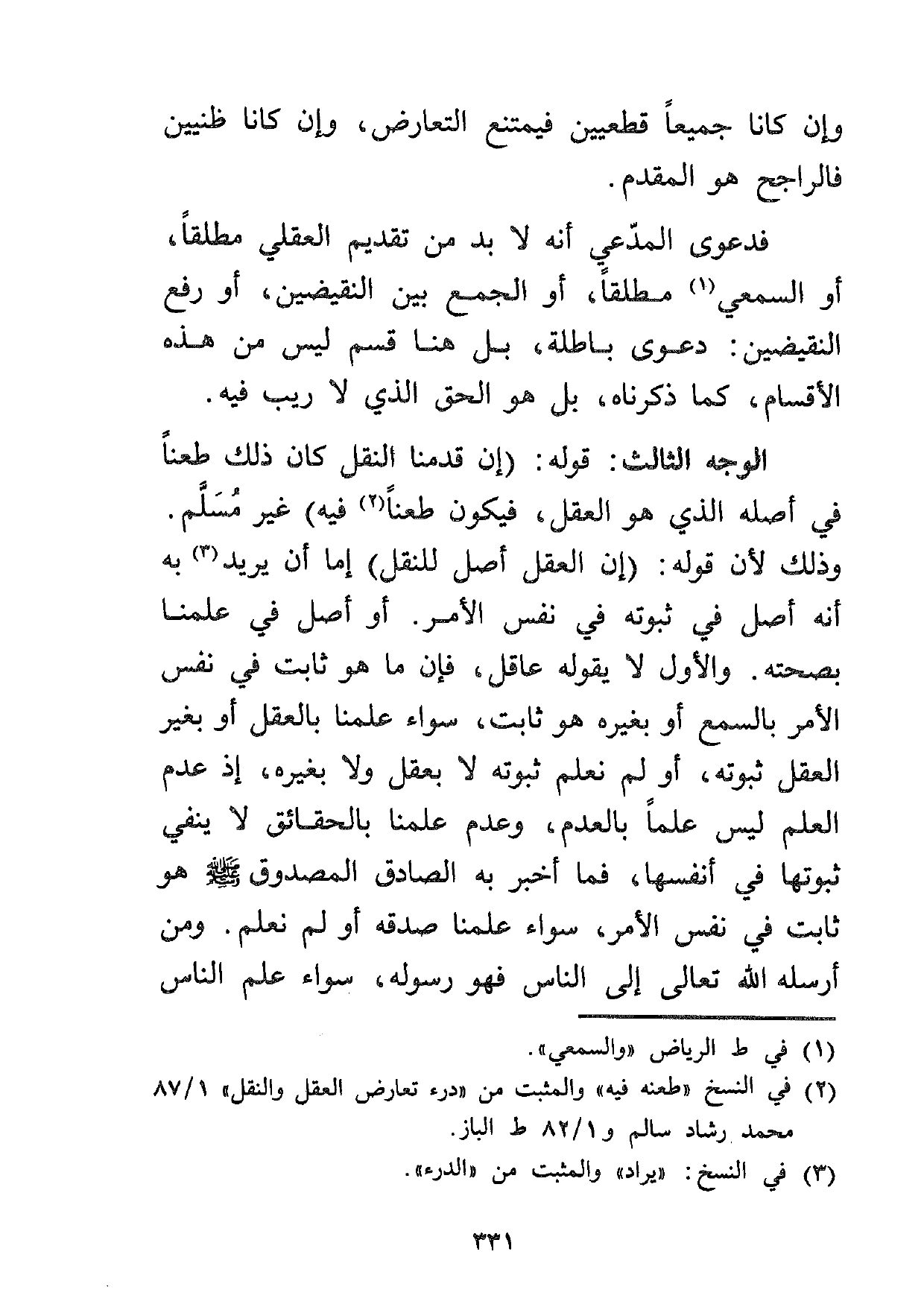 الوجه الثالث: قوله: (إن قدمنا النقل كان ذلك طعناً في أصله الذي هو العقل، فيكون طعناً2 فيه) غير مسلم. وذلك لأن قوله: (إن العقل أصل للنقل) إما أن يريد3 به أنه أصل في ثبوته في نفس الأمر. أو أصل في علمنا بصحته. والأول لا يقوله عاقل، فإن ما هو ثابت في نفس الأمر بالسمع أو بغيره هو ثابت، سواء علمنا بالعقل أو بغير العقل ثبوته، أو لم نعلم ثبوته لا بعقل ولا بغيره، إذ عدم العلم ليس علماً بالعدم، وعدم علمنا بالحقائق لا ينفي ثبوتها في أنفسها، فما أخبر به الصادق المصدوق صلى الله عليه وسلم هو ثابت في نفس الأمر، سواء علمنا صدقه أو لم نعلم. ومن أرسله الله تعالى إلى الناس فهو رسوله، سواء علم الناس