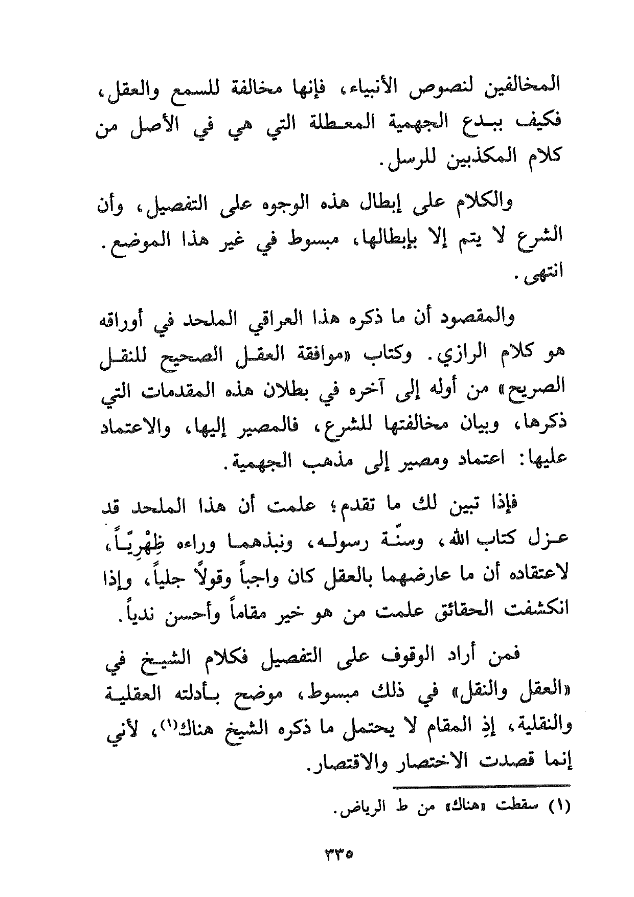 والمقصود أن ما ذكره هذا العراقي الملحد في أوراقه هو كلام الرازي. وكتاب "موافقة العقل الصحيح للنقل الصريح" من أوله إلى آخره في بطلان هذه المقدمات التي ذكرها، وبيان مخالفتها للشرع، فالمصير إليها، والاعتماد عليها: اعتماد ومصير إلى مذهب الجهمية.