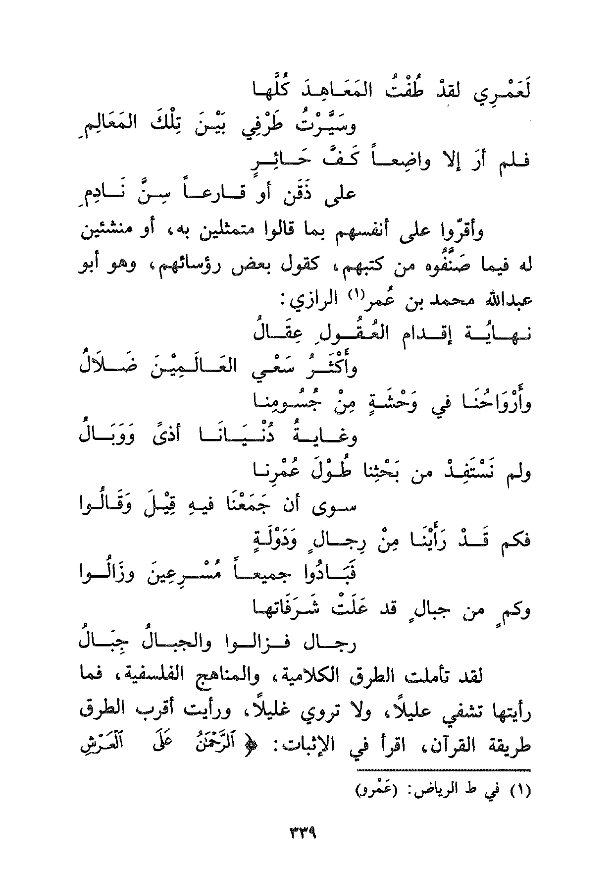 لقد تأملت الطرق الكلامية، والمناهج الفلسفية، فما رأيتها تشفي عليلاً، ولا تروي غليلاً، ورأيت أقرب الطرق طريقة القرآن، اقرأ في الإثبات: {الرَّحْمَنُ عَلَى الْعَرْشِ