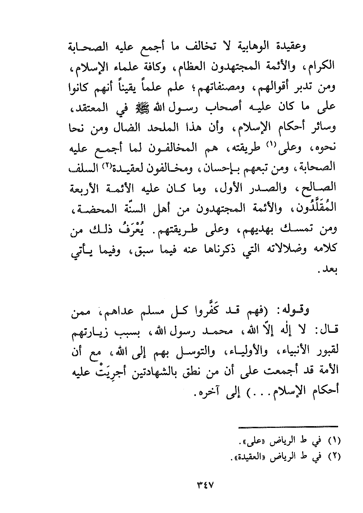 وعقيدة الوهابية لا تخالف ما أجمع عليه الصحابة الكرام، والأئمة المجتهدون العظام، وكافة علماء الإسلام، ومن تدبر أقوالهم، ومصنفاتهم، علم علماً يقيناً أنهم كانوا على ما كان عليه أصحاب رسول الله صلى الله عليه وسلم في المعتقد، وسائر أحكام الإسلام، وأن هذا الملحد الضال ومن نحا نحوه، وعلى1 طريقته، هم المخالفون لما أجمع عليه الصحابة، ومن تبعهم بإحسان، ومخالفون لعقيدة2 السلف الصالح، والصدر الأول، وما كان عليه الأئمة الأربعة المقلدون، والأئمة المجتهدون من أهل السنة المحضة، ومن تمسك بهديهم، وعلى طريقتهم. يعرف ذلك من كلامه وضلالاته التي ذكرناها عنه فيما يأتي بعد.