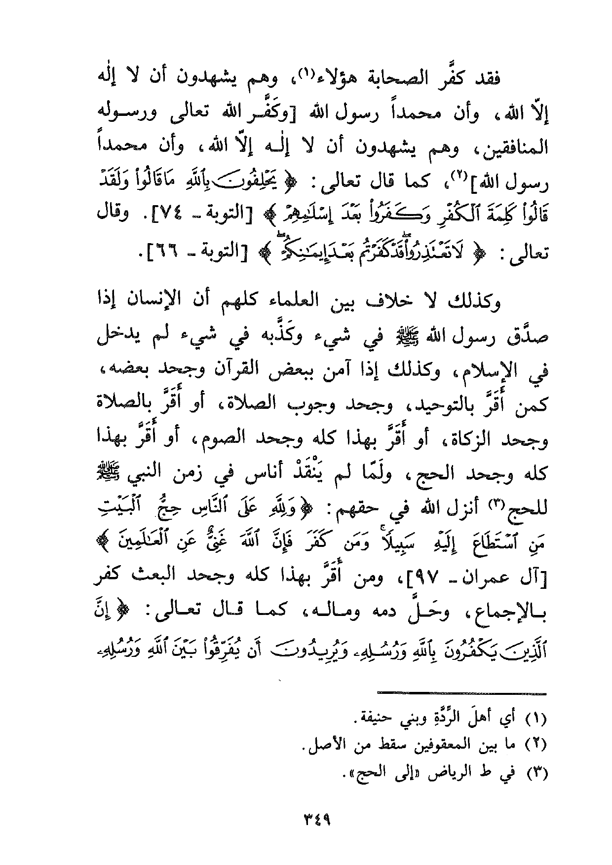 وكذلك لا خلاف بين العلماء كلهم أن الإنسان إذا صدق رسول الله صلى الله عليه وسلم في شيء وكذبه في شيء لم يدخل في الإسلام، وكذلك إذا آمن ببعض القرآن وجحد بعضه، كمن أقر بالتوحيد وجحد وجوب الصلاة، أو أقر بالصلاة وجحد الزكاة، أو أقر بهذا كله وجحد الصوم، أو أقر بهذا كله وجحد الصوم، أو أقر بهذا كله وجحد الحج، ولما لم ينقد أناس في زمن النبي صلى الله عليه وسلم للحج3 أنزل الله في حقهم: {وَلِلَّهِ عَلَى النَّاسِ حِجُّ الْبَيْتِ مَنِ اسْتَطَاعَ إِلَيْهِ سَبِيلاً وَمَنْ كَفَرَ فَإِنَّ اللَّهَ غَنِيٌّ عَنِ الْعَالَمِينَ} [آل عمران: 97] ، ومن أقر بهذا كله وجحد البعث كفر بالإجماع، وحل دمه وماله، كما قال تعالى: {إِنَّ الَّذِينَ يَكْفُرُونَ بِاللَّهِ وَرُسُلِهِ وَيُرِيدُونَ أَنْ يُفَرِّقُوا بَيْنَ اللَّهِ وَرُسُلِهِ